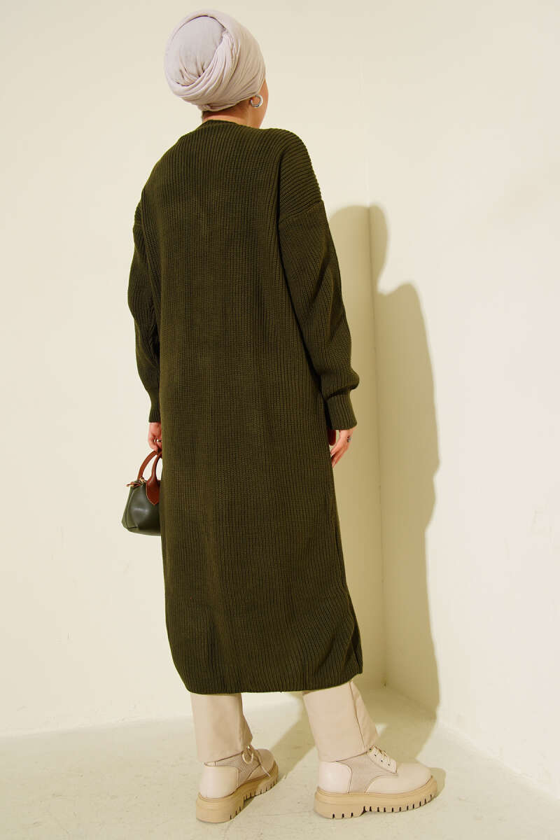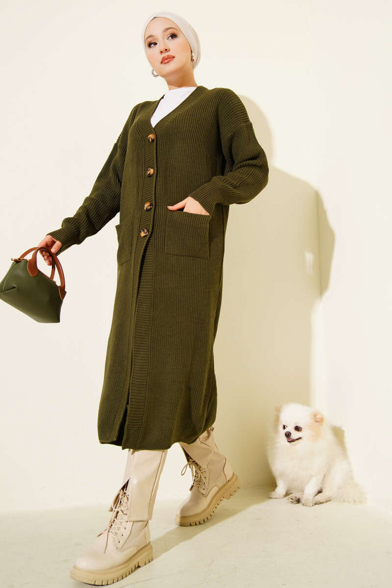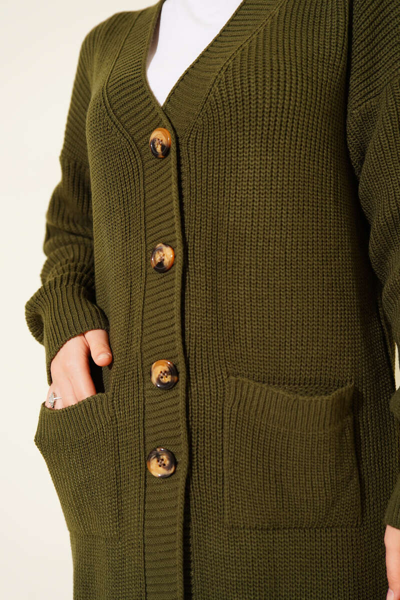 Düğmeli Cepli Uzun Triko Hırka Haki