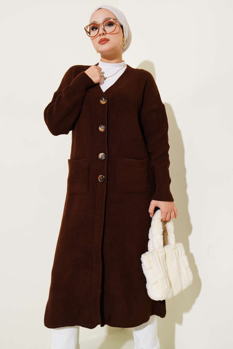 Düğmeli Cepli Uzun Triko Hırka Bej