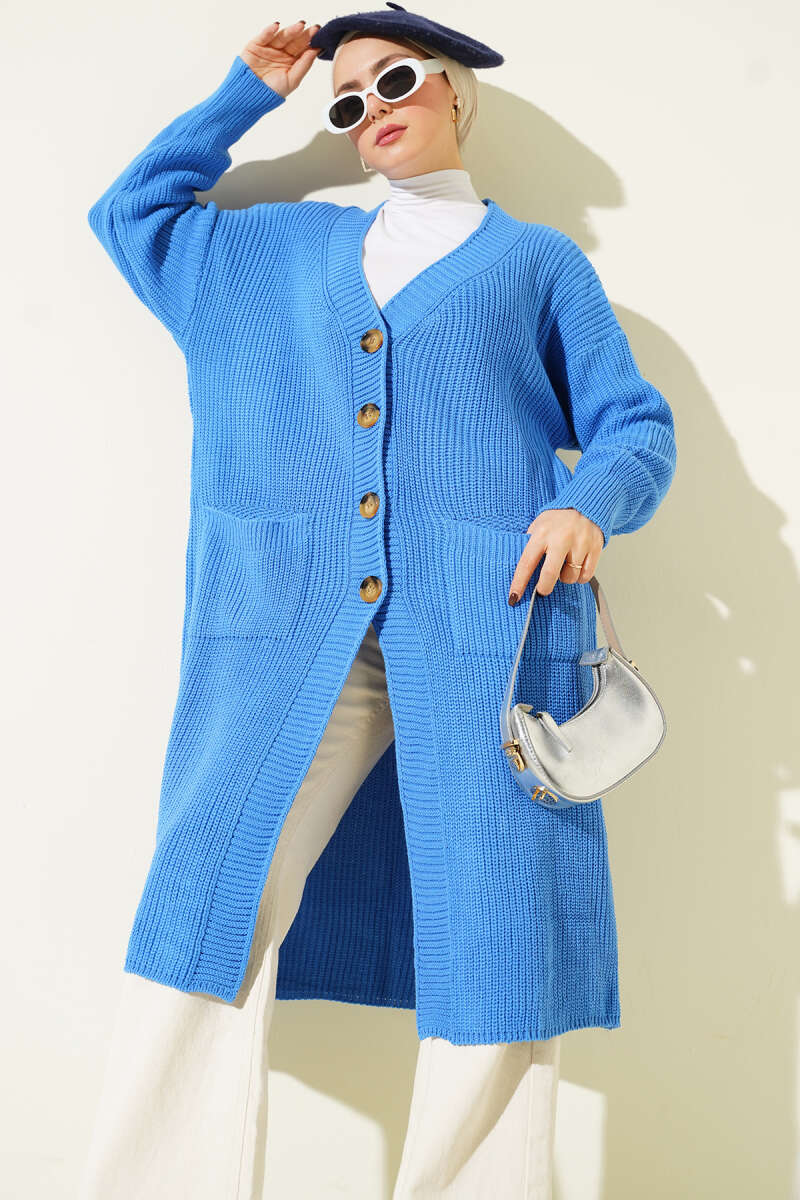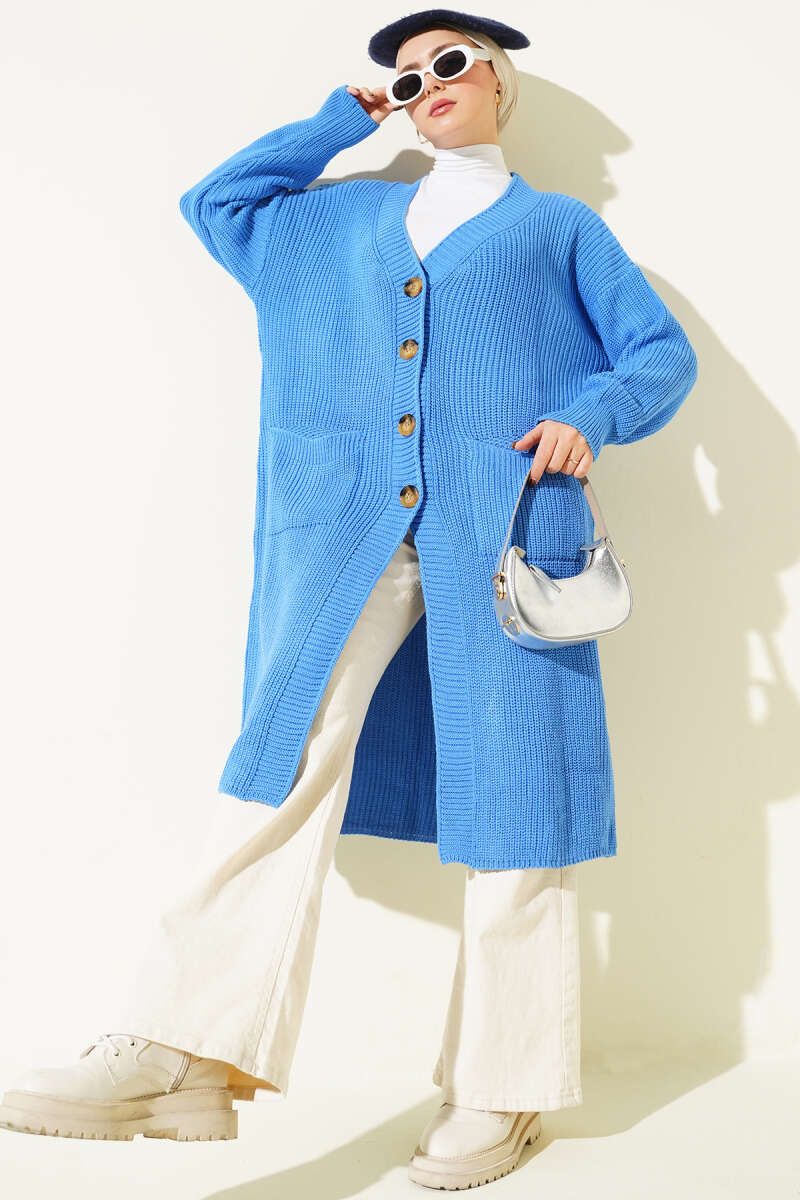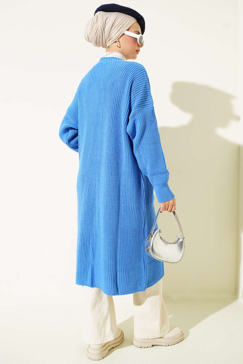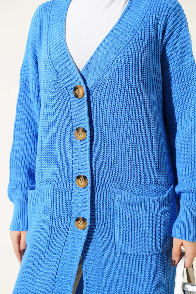 Düğmeli Ajurlu Kısa Triko Hırka Mavi