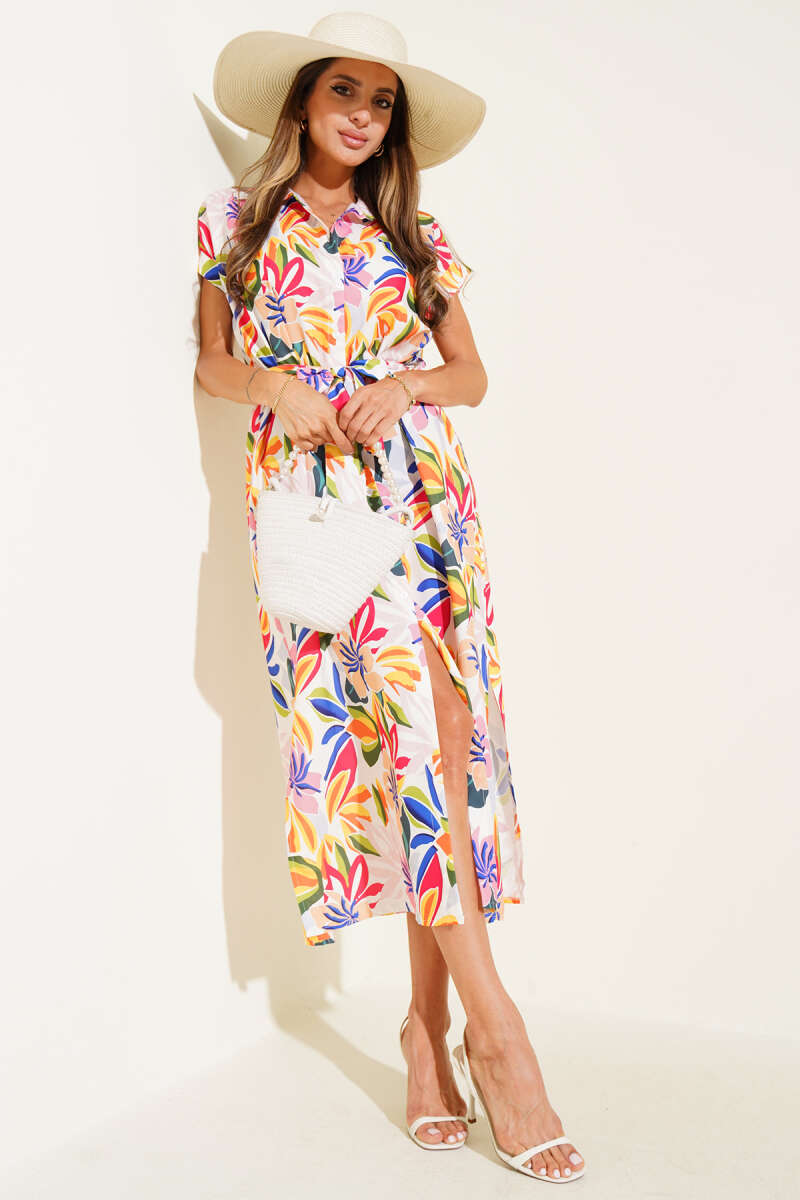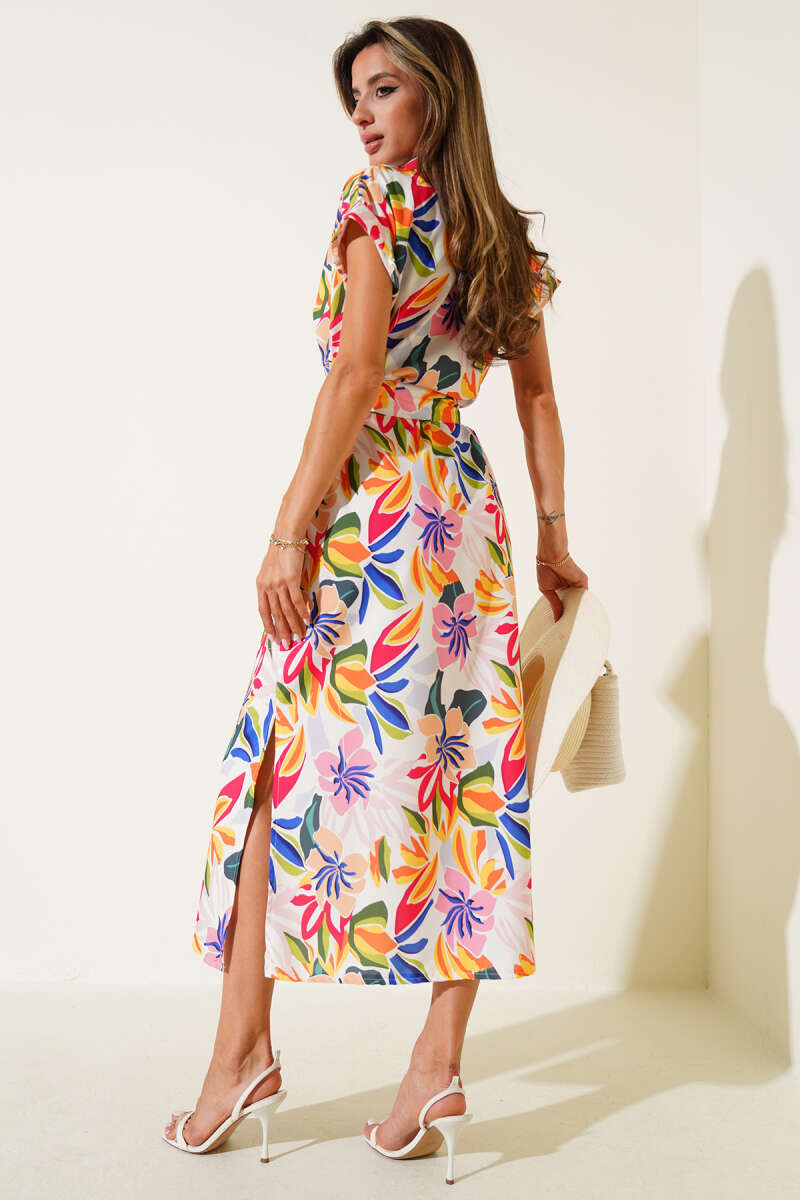Düğmeli Desenli Midi Elbise Sarı