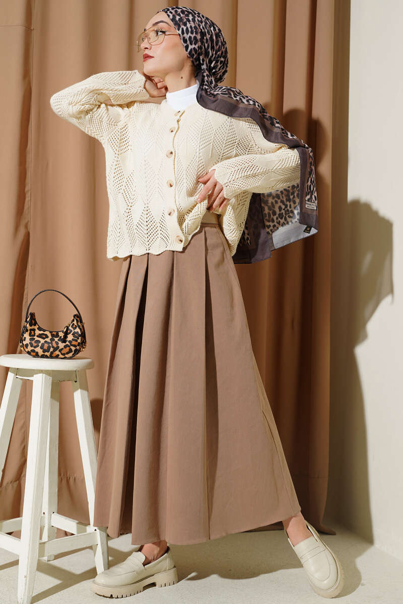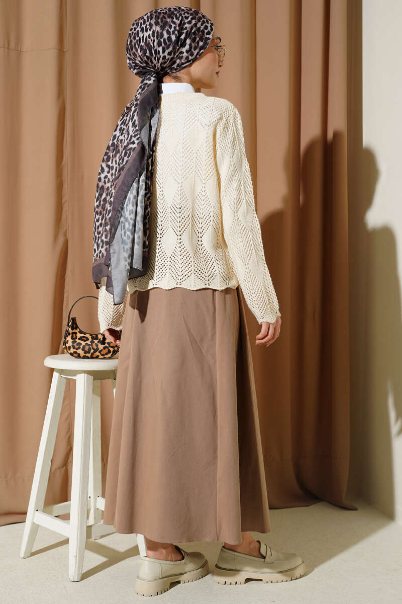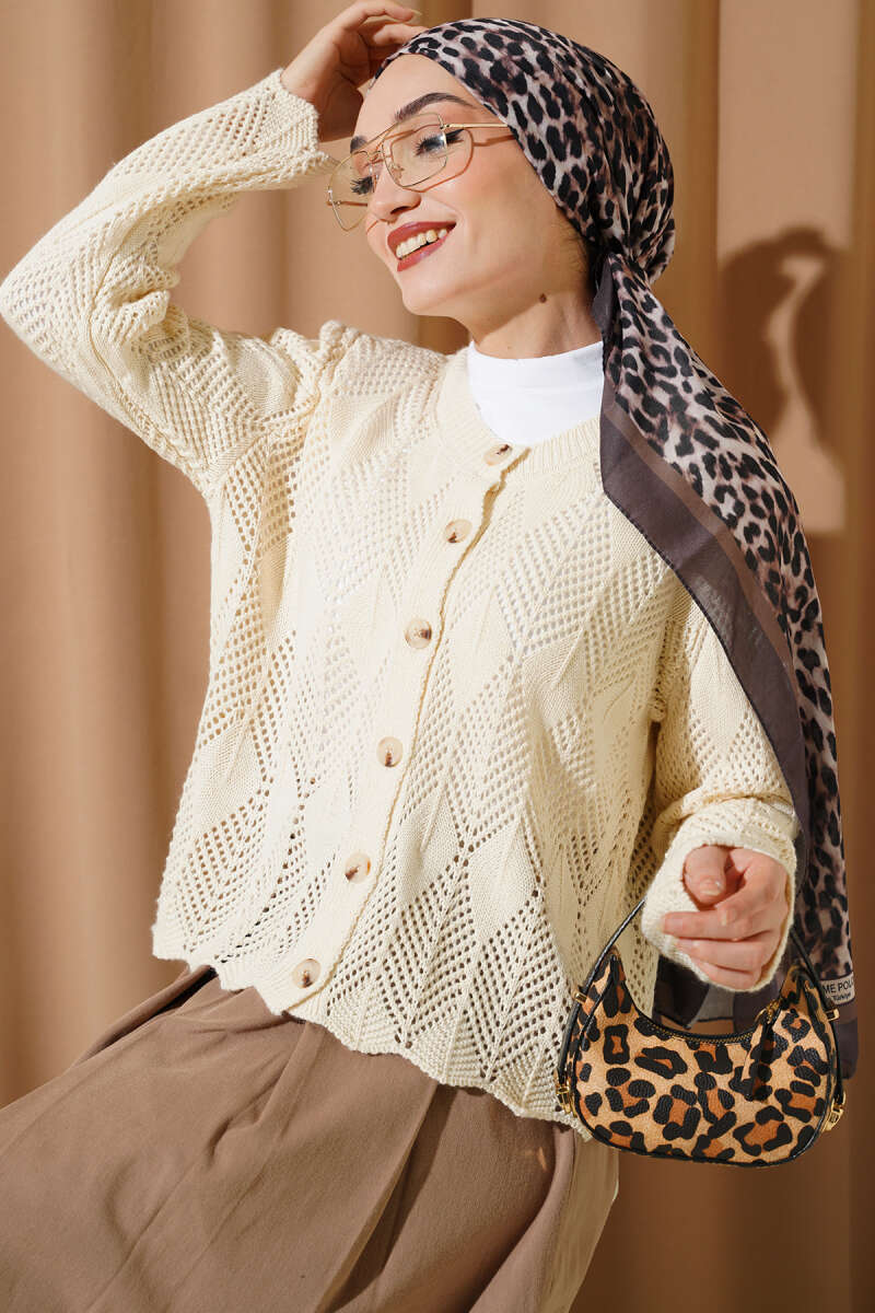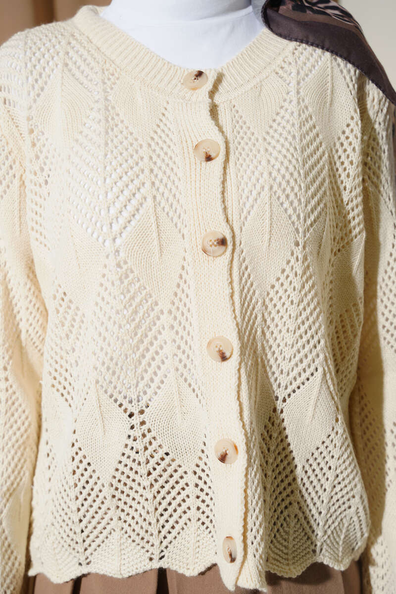 Düğmeli Desenli Triko Kısa Ajur Hırka Bej