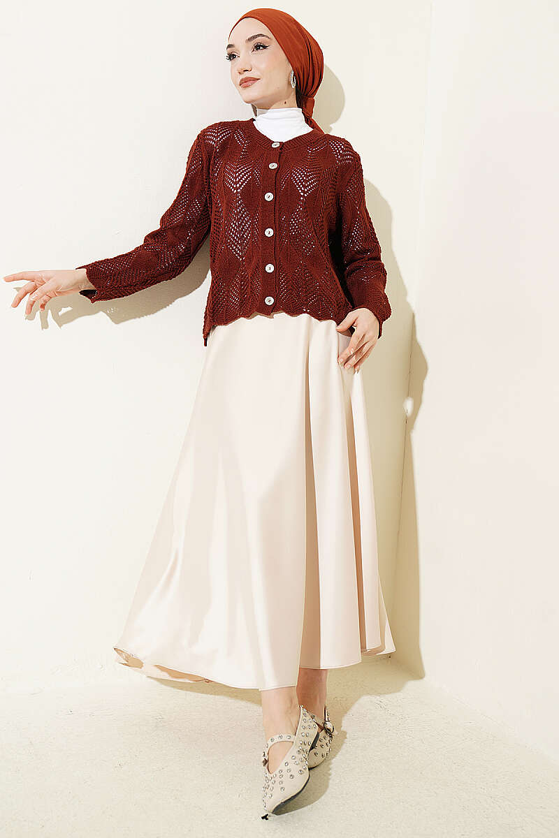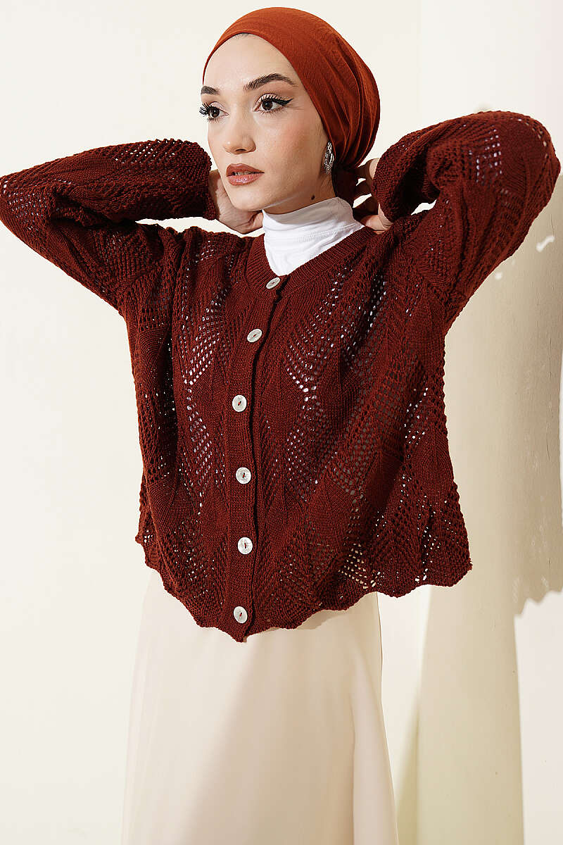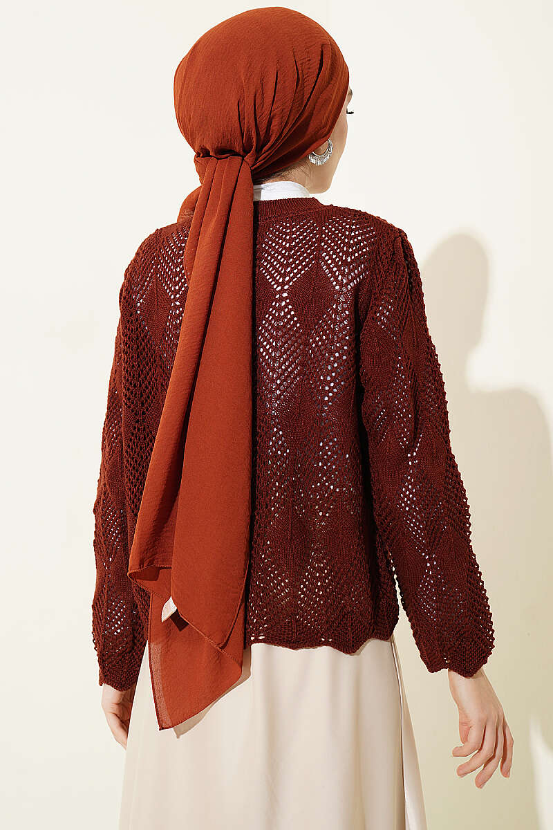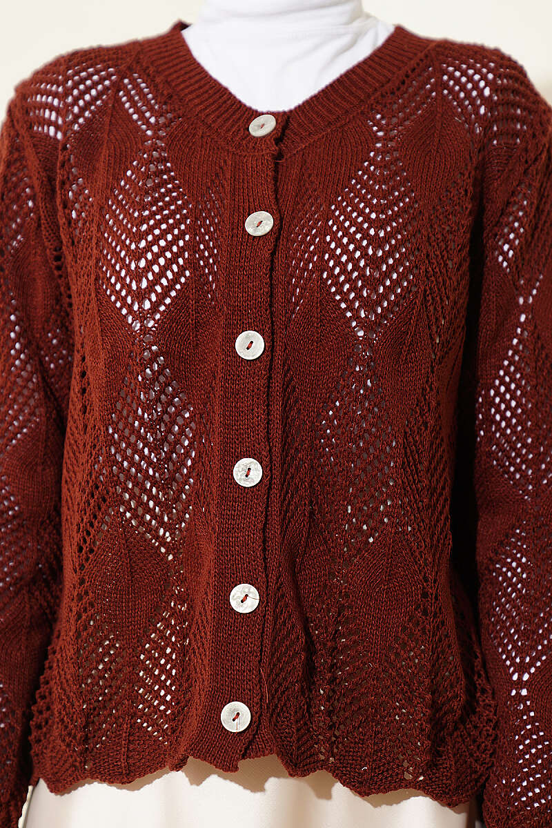 Düğmeli Desenli Triko Kısa Ajur Hırka Kiremit