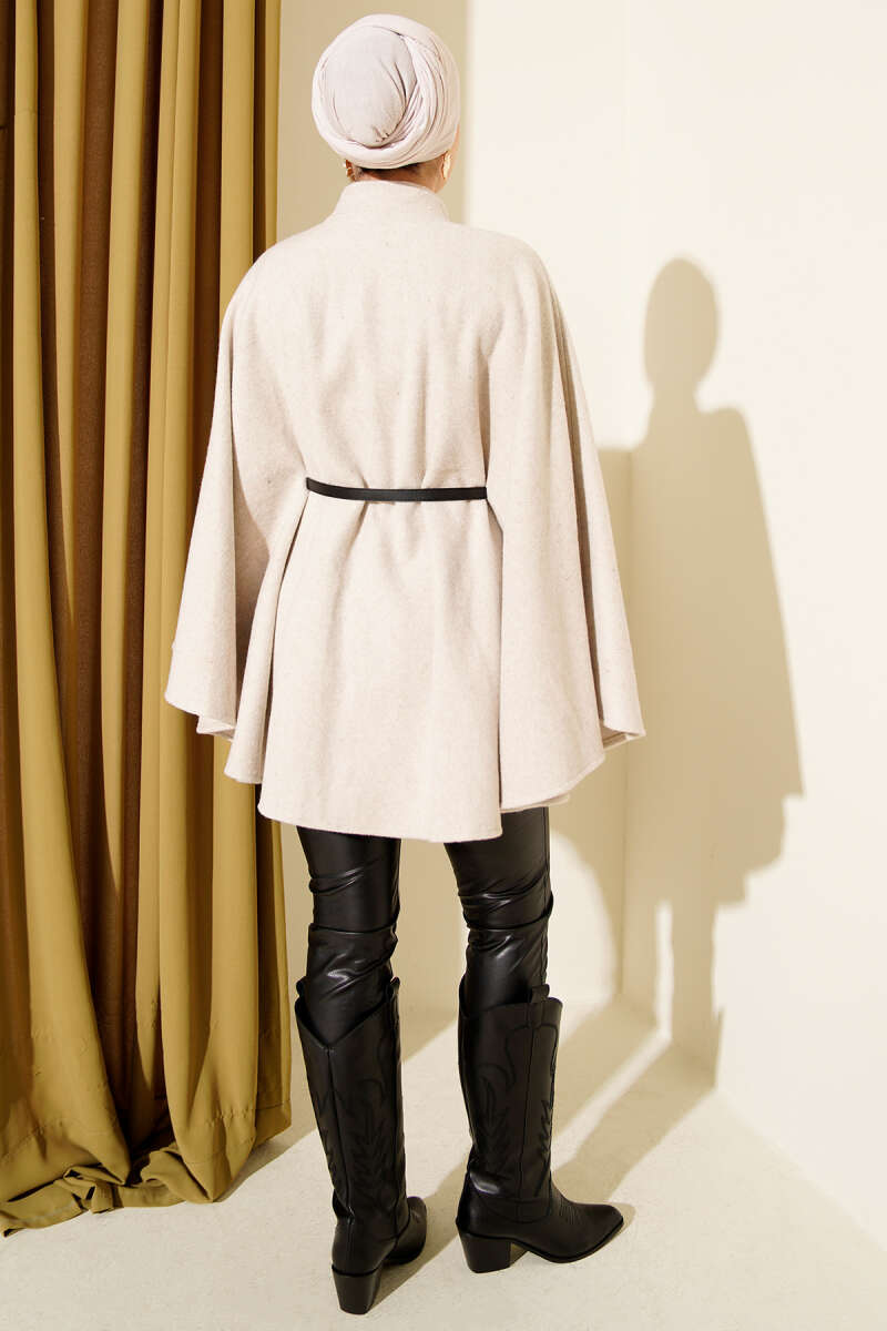 Çıtçıt Düğmeli Kapüşonlu Triko Panço Bej