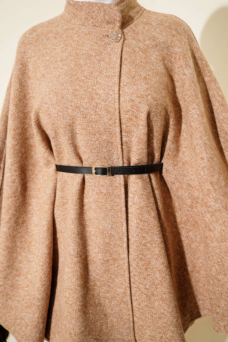 İnce Kemerli Gömlek Yaka Kaşe Panço Bej