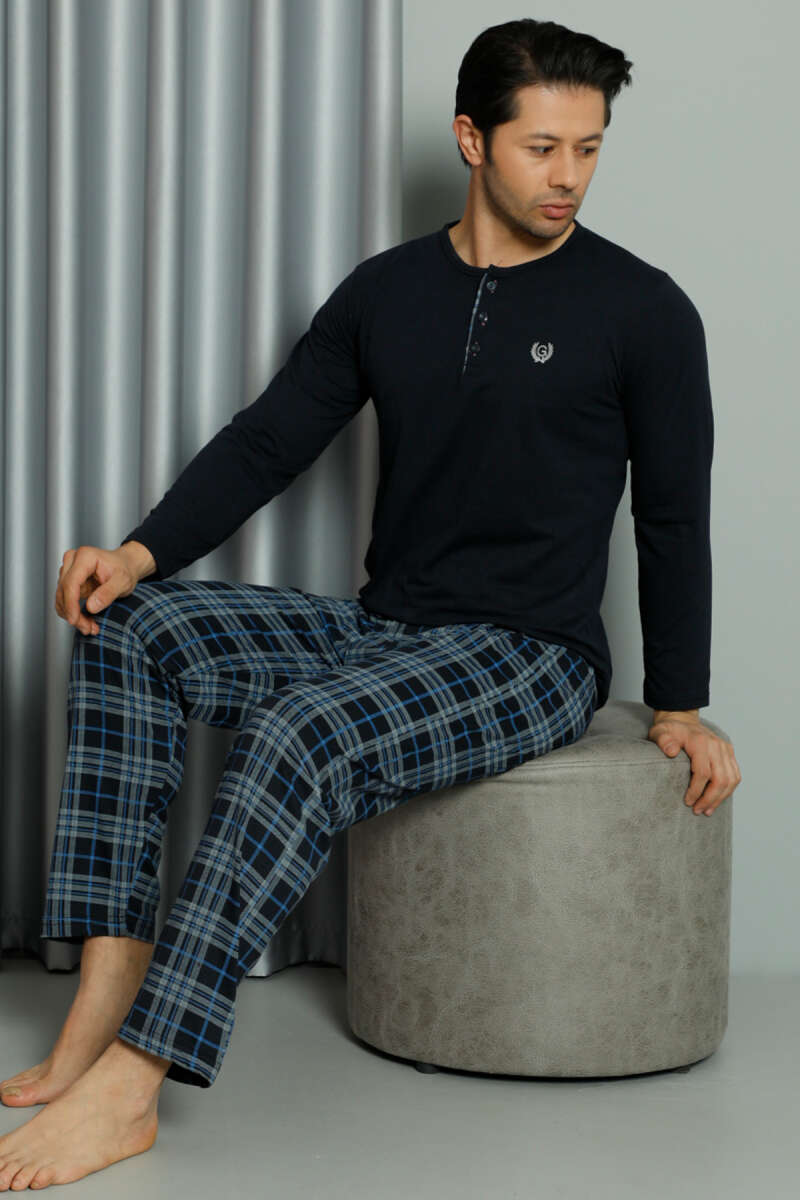 Düğmeli Ekoseli Uzun Kol Erkek Pijama Takım Lacivert