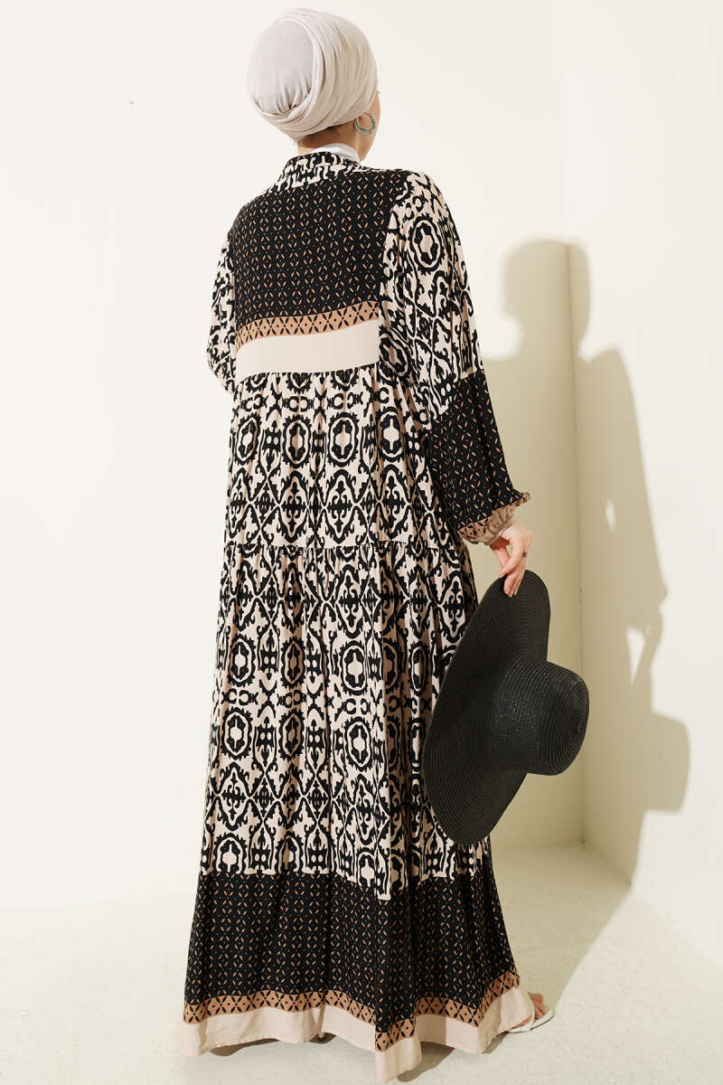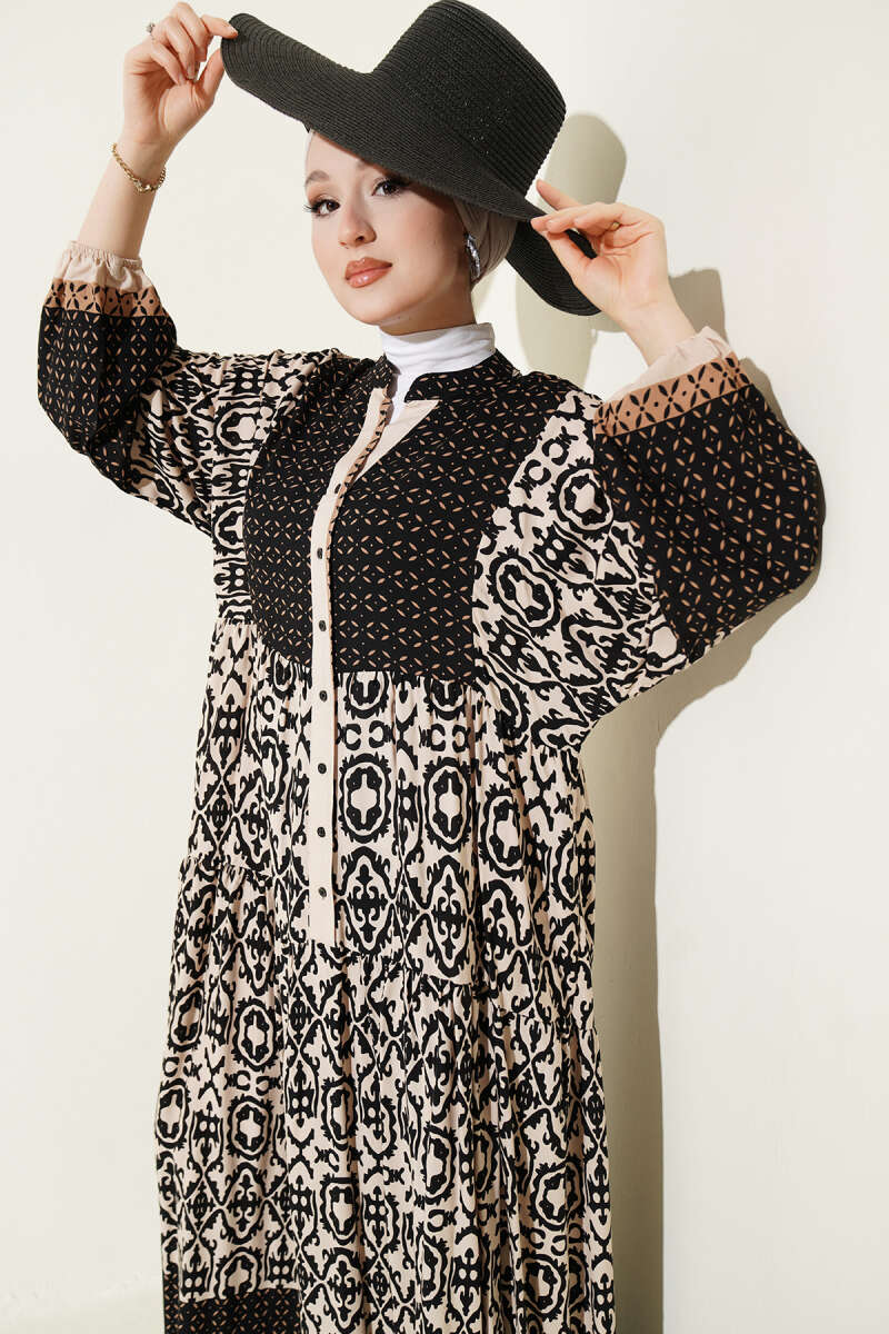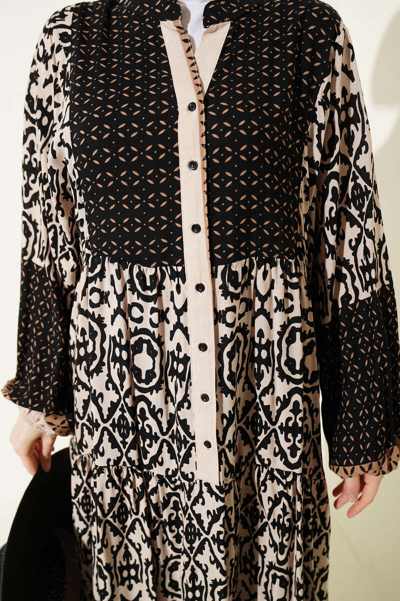 Düğmeli Etnik Desenli Katlı Elbise Bej