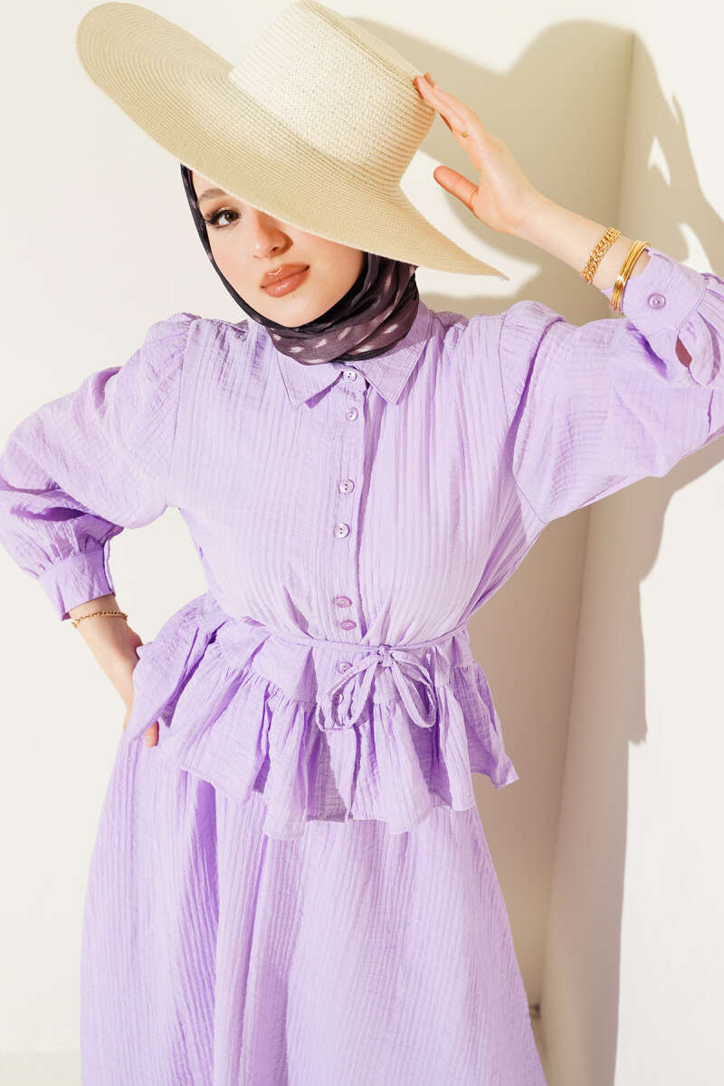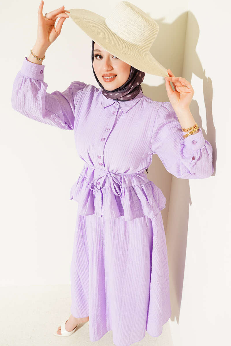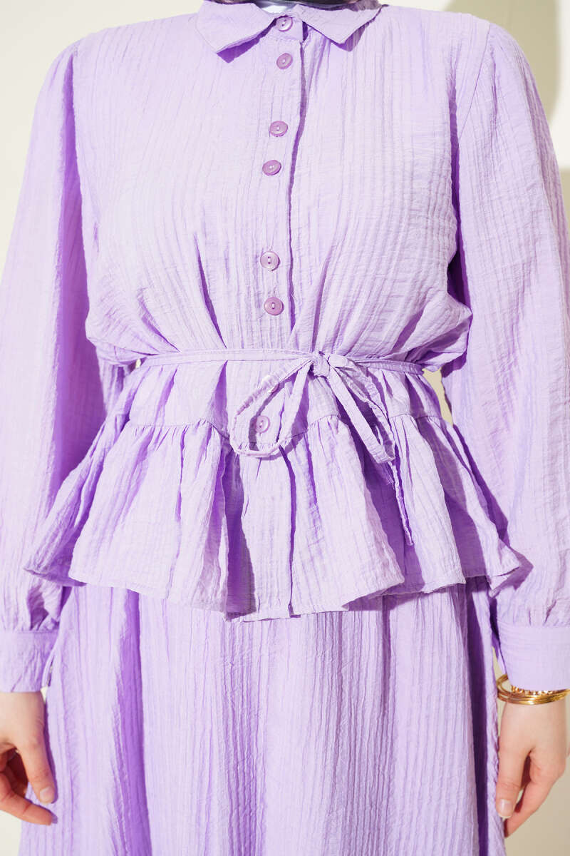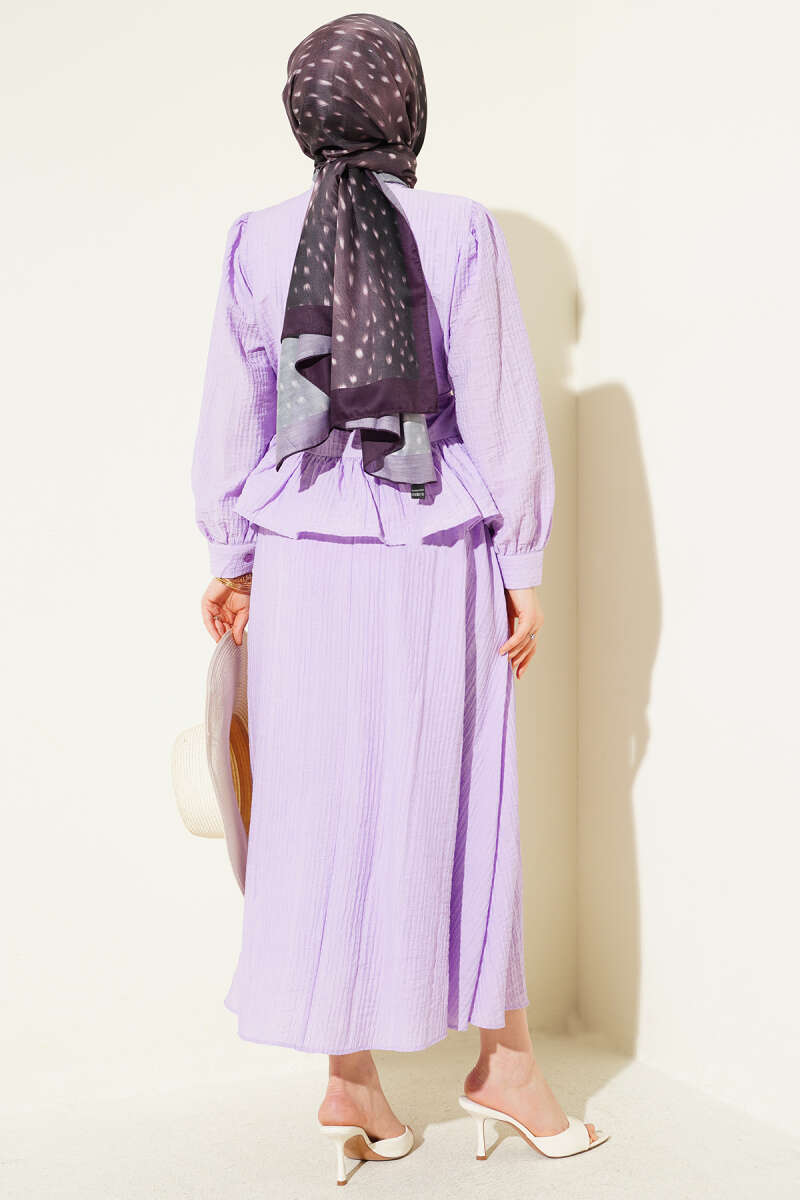 Düğmeli Fırfırlı Etekli İkili Takım Lila