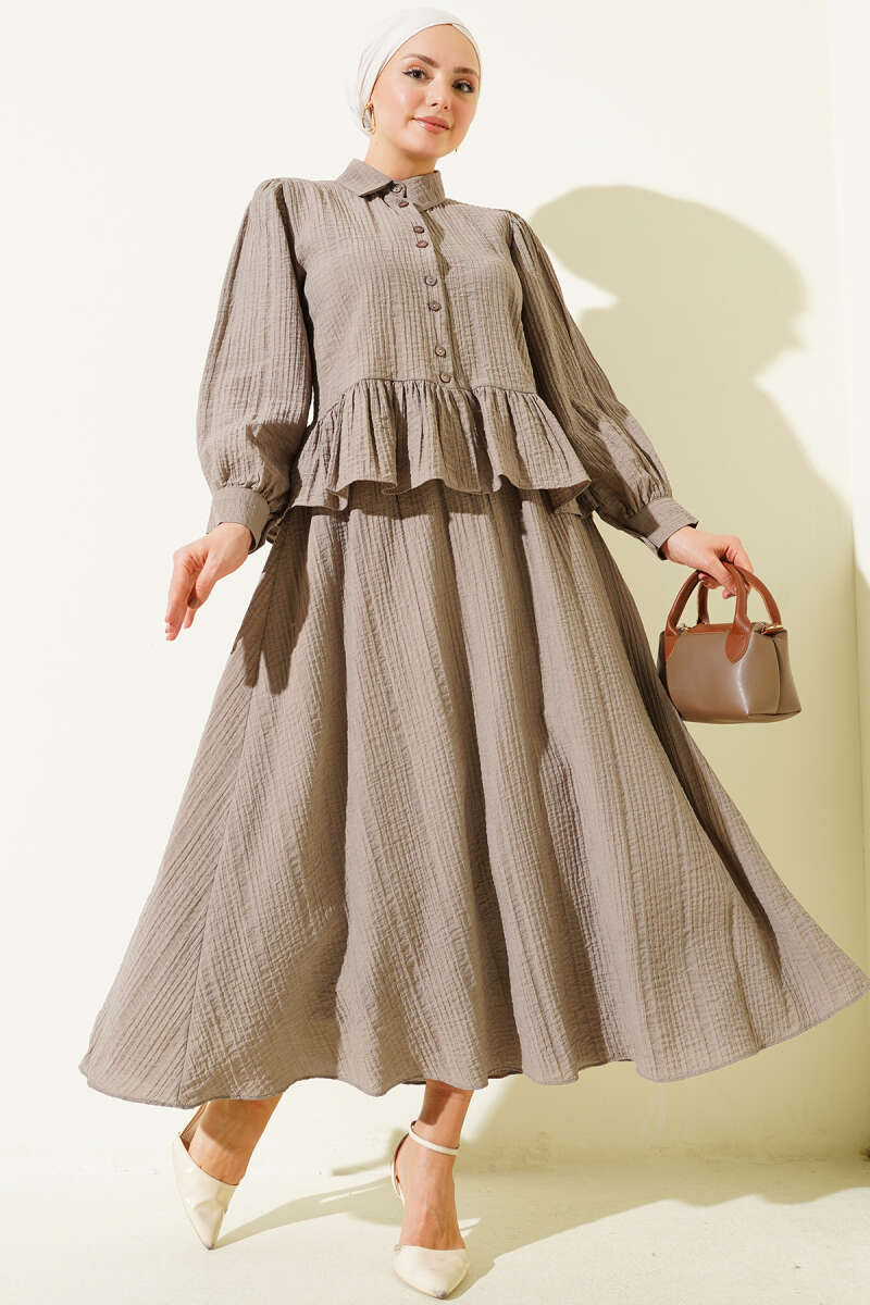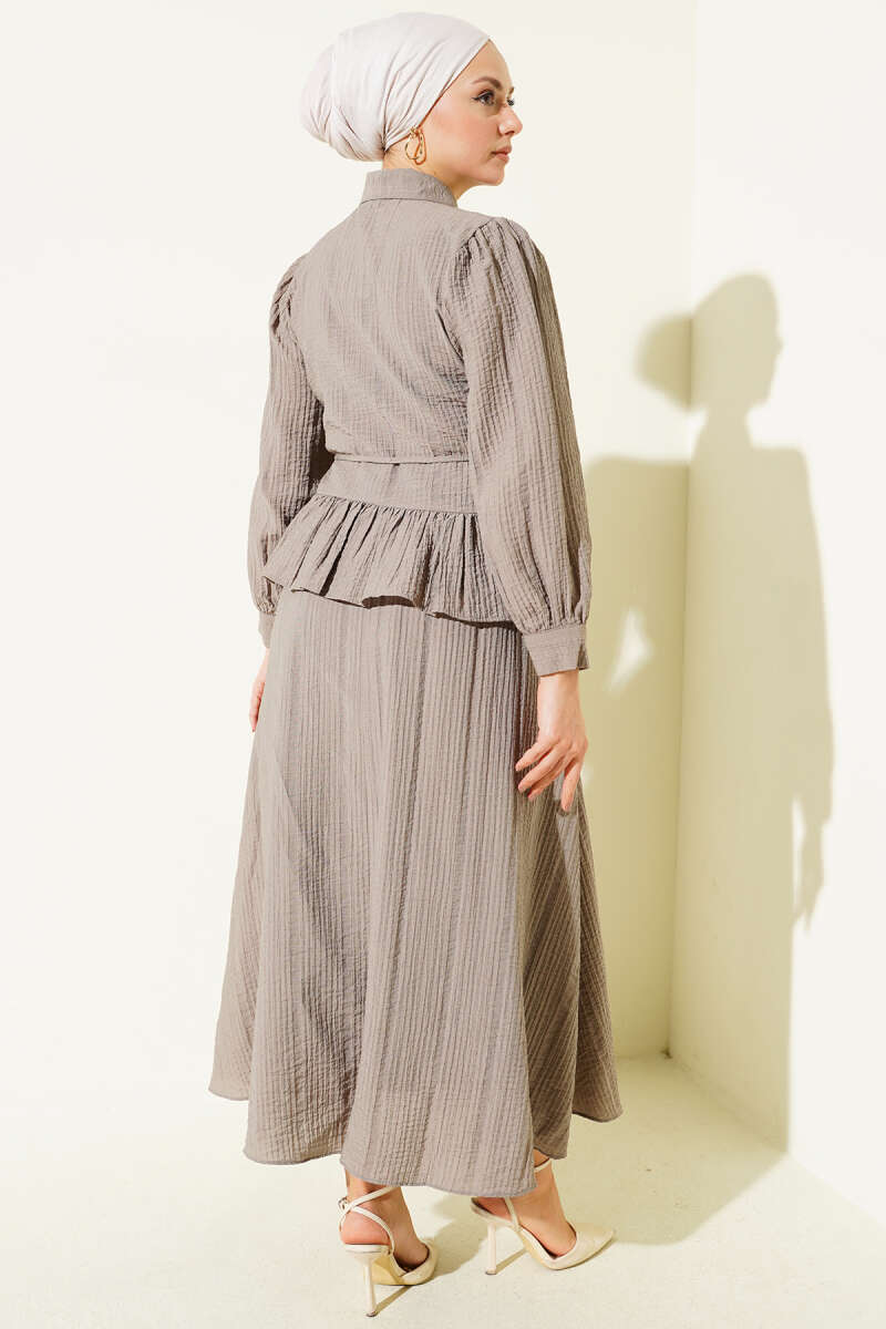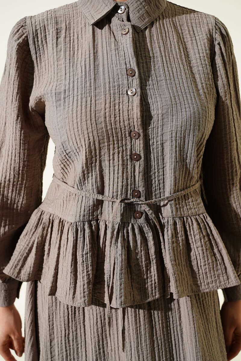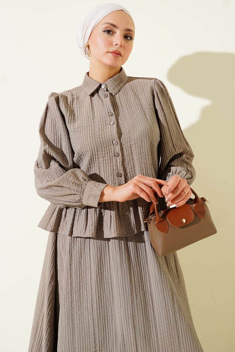 Düğmeli Fırfırlı Etekli İkili Takım Acı Kahve