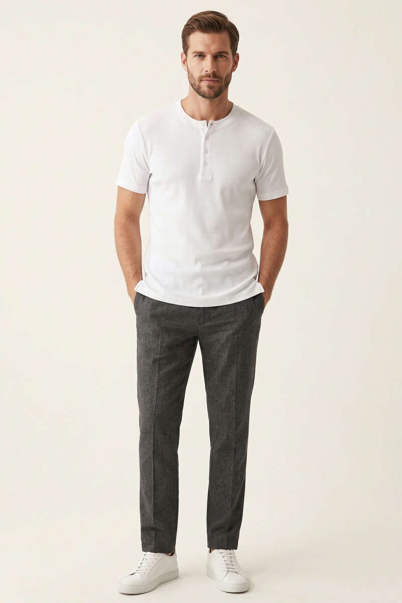 Düğmeli Fitilli Erkek T-shirt Beyaz