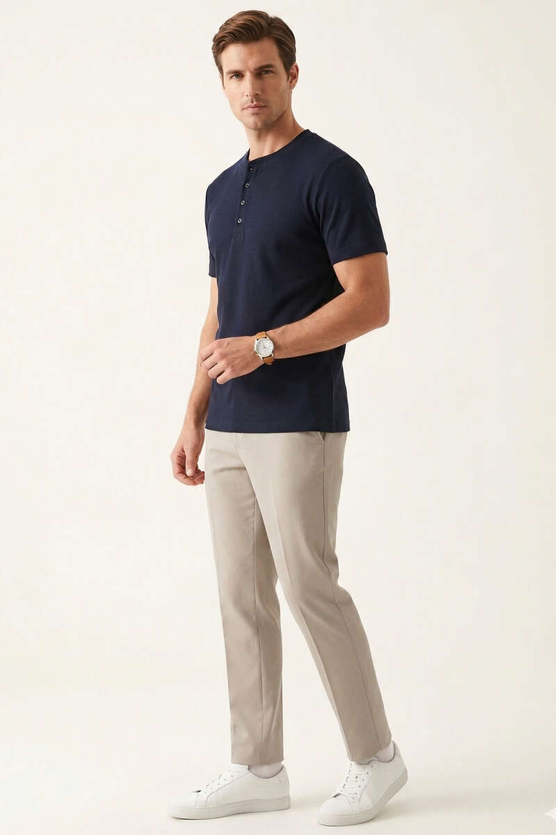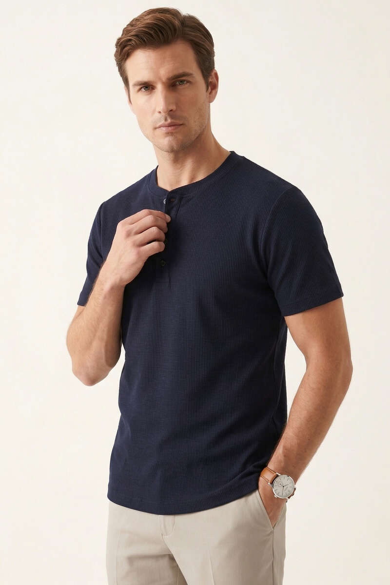 Düğmeli Fitilli Erkek T-shirt Lacivert