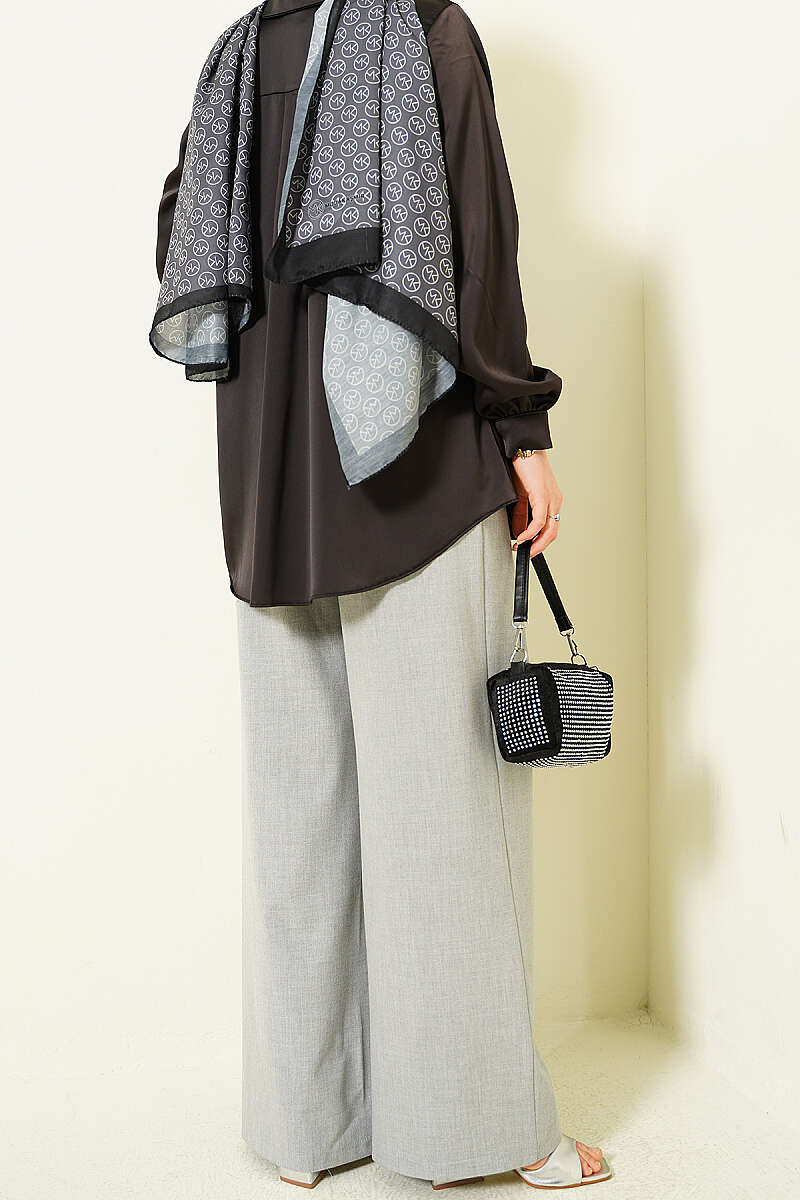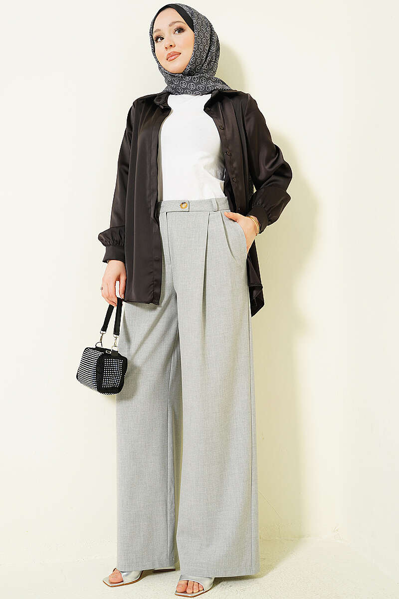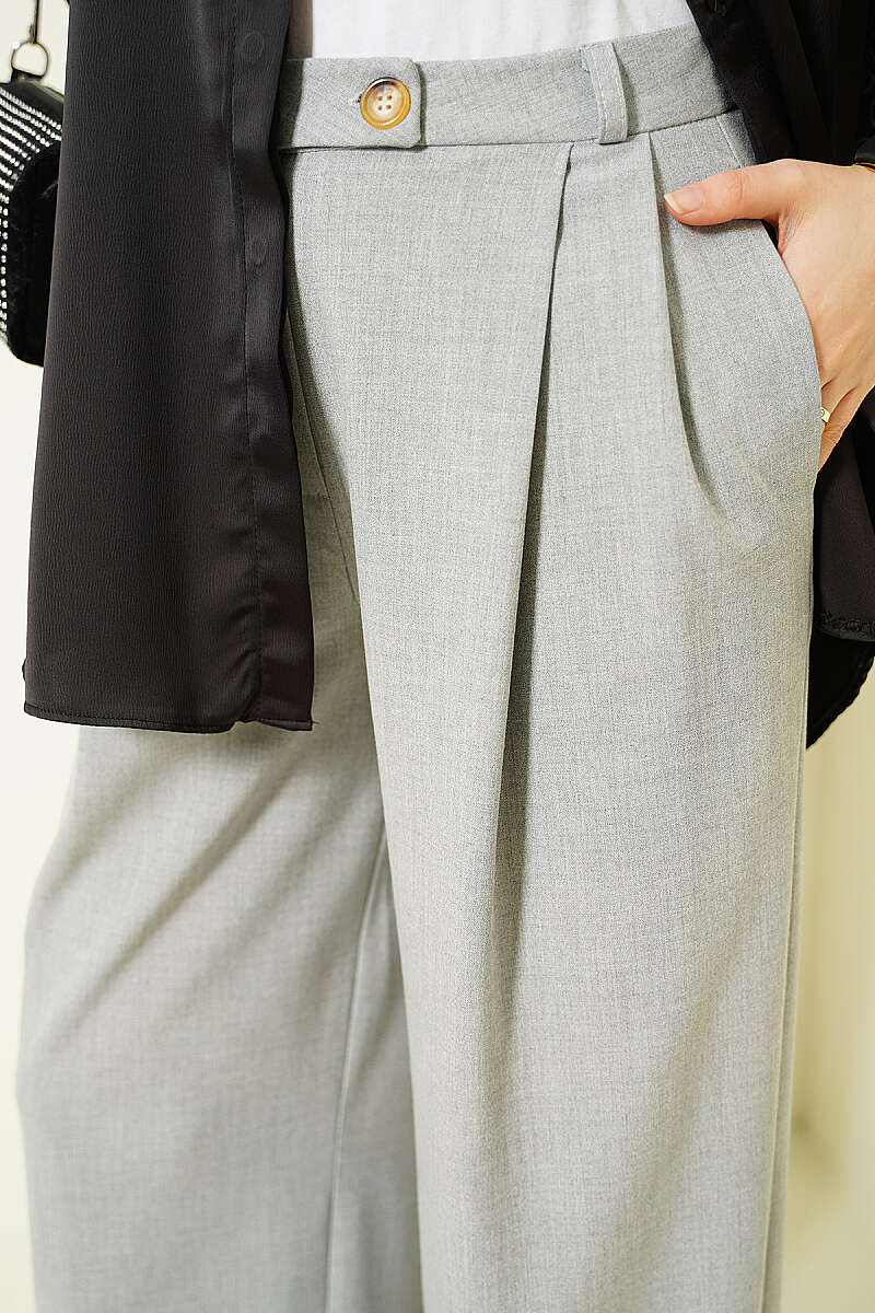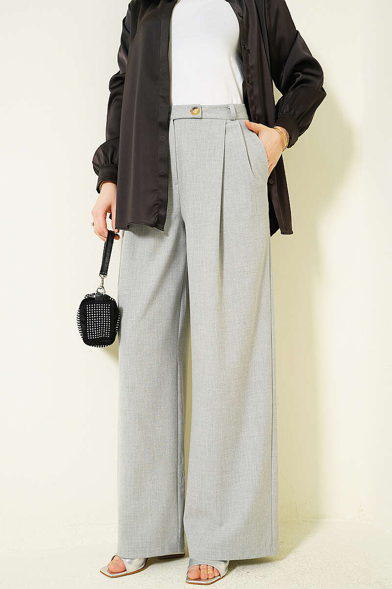 Düğmeli Geniş Paça Kumaş Pantolon Gri