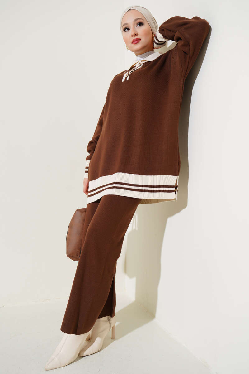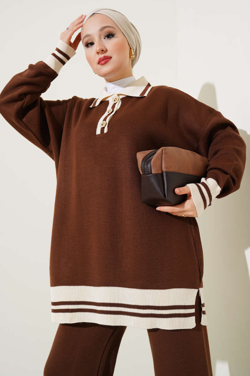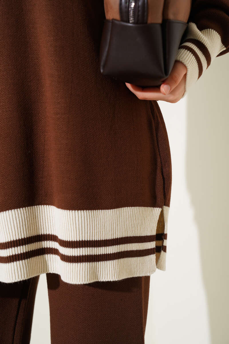 Balon Kol Balıkçı Yaka Triko İkili Takım Kahve