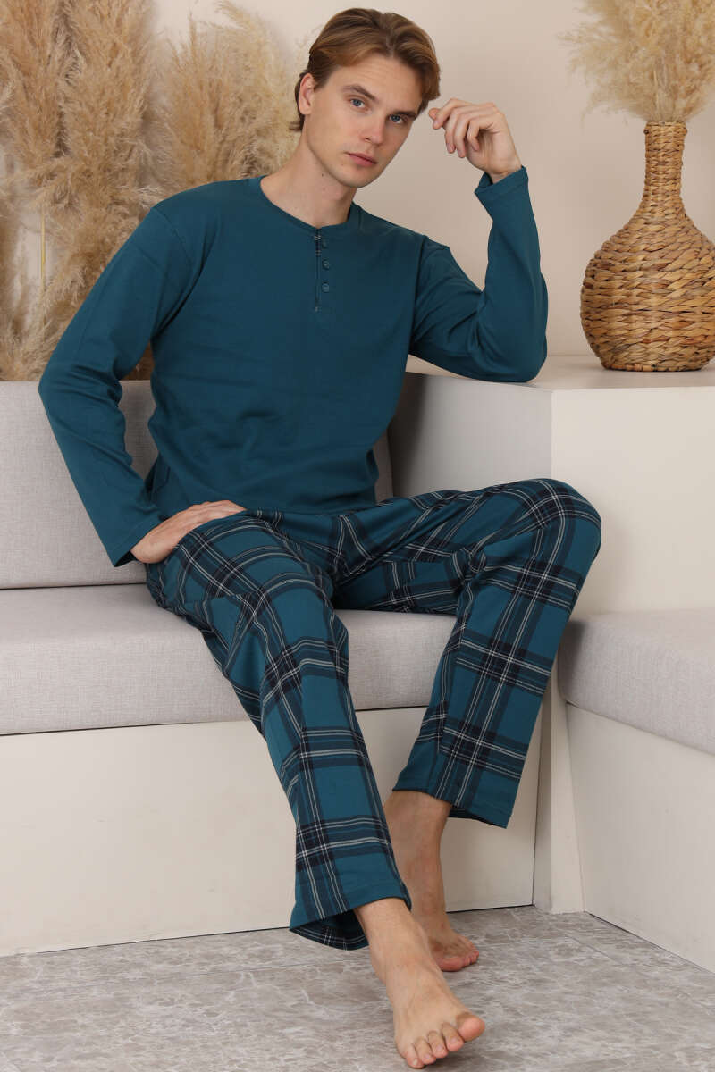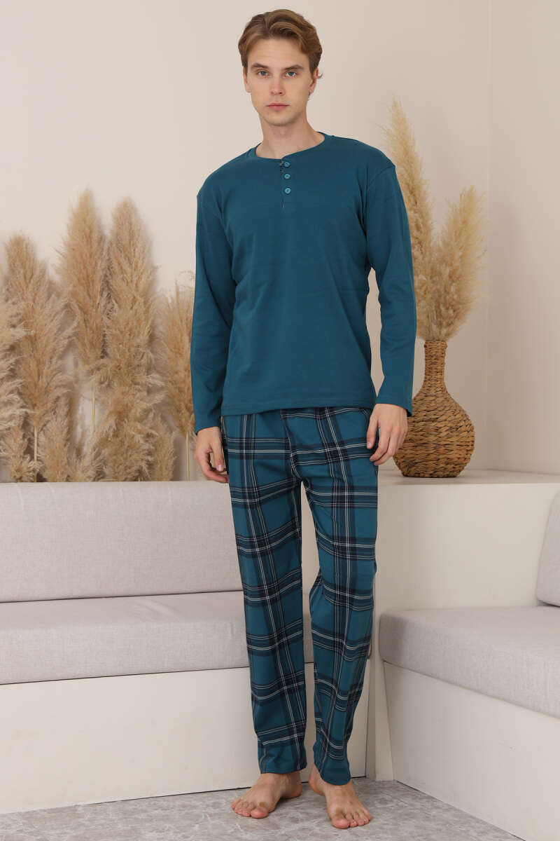 Düğmeli İnterlok Erkek Pijama Takımı Petrol