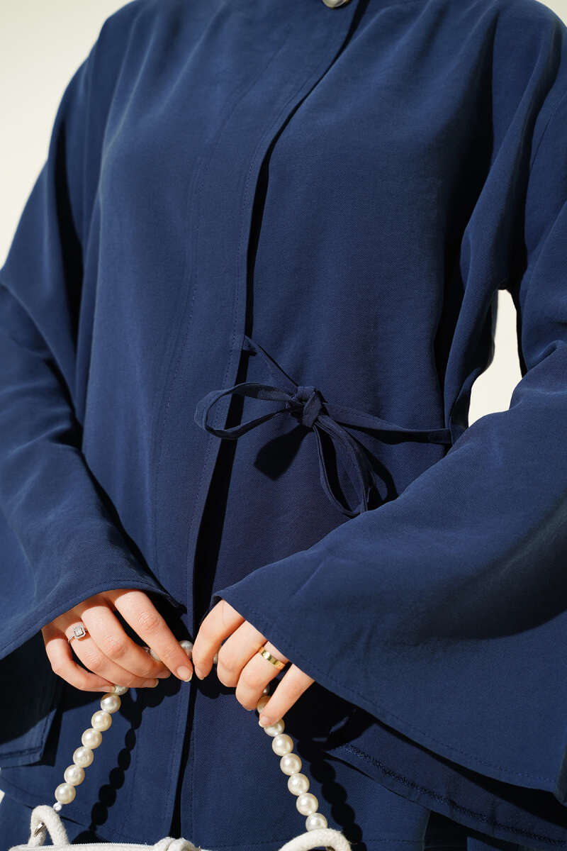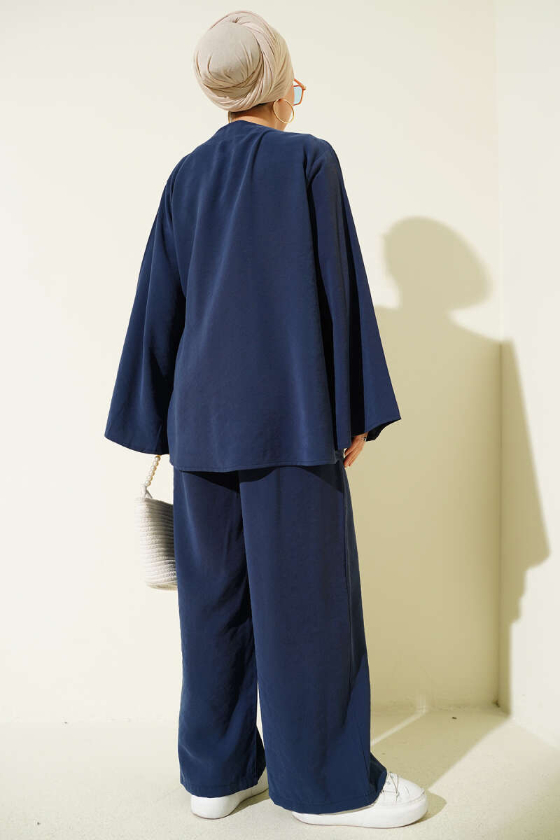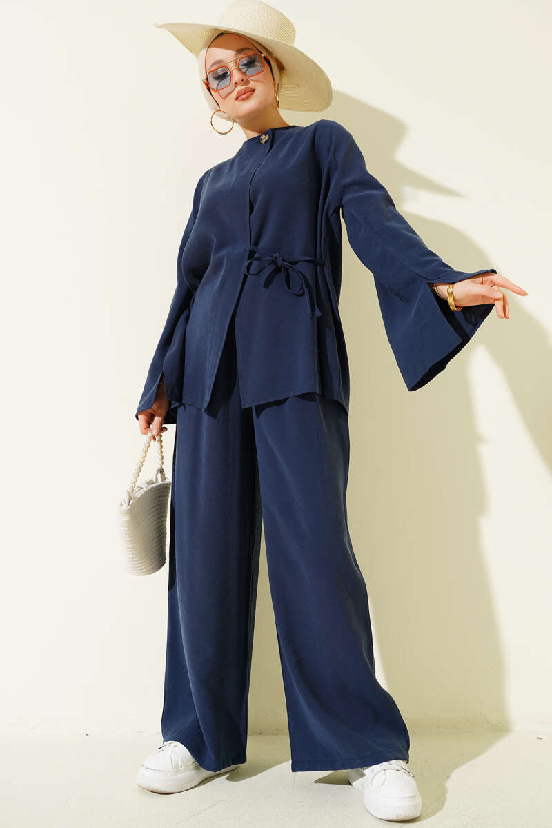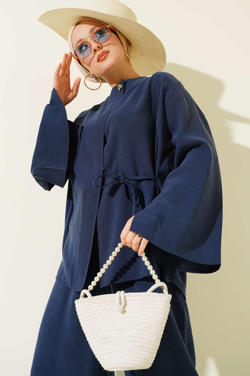 Düğmeli İp Bağlamalı Tensel İkili Takım Lacivert