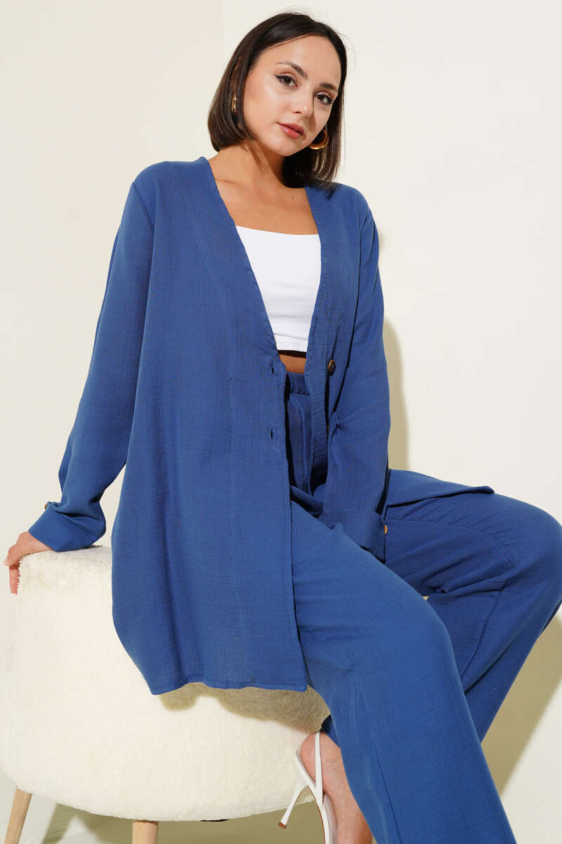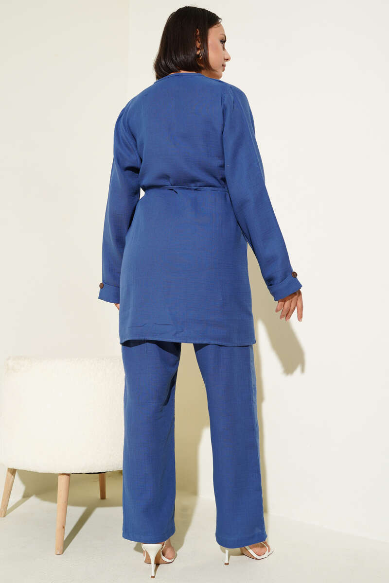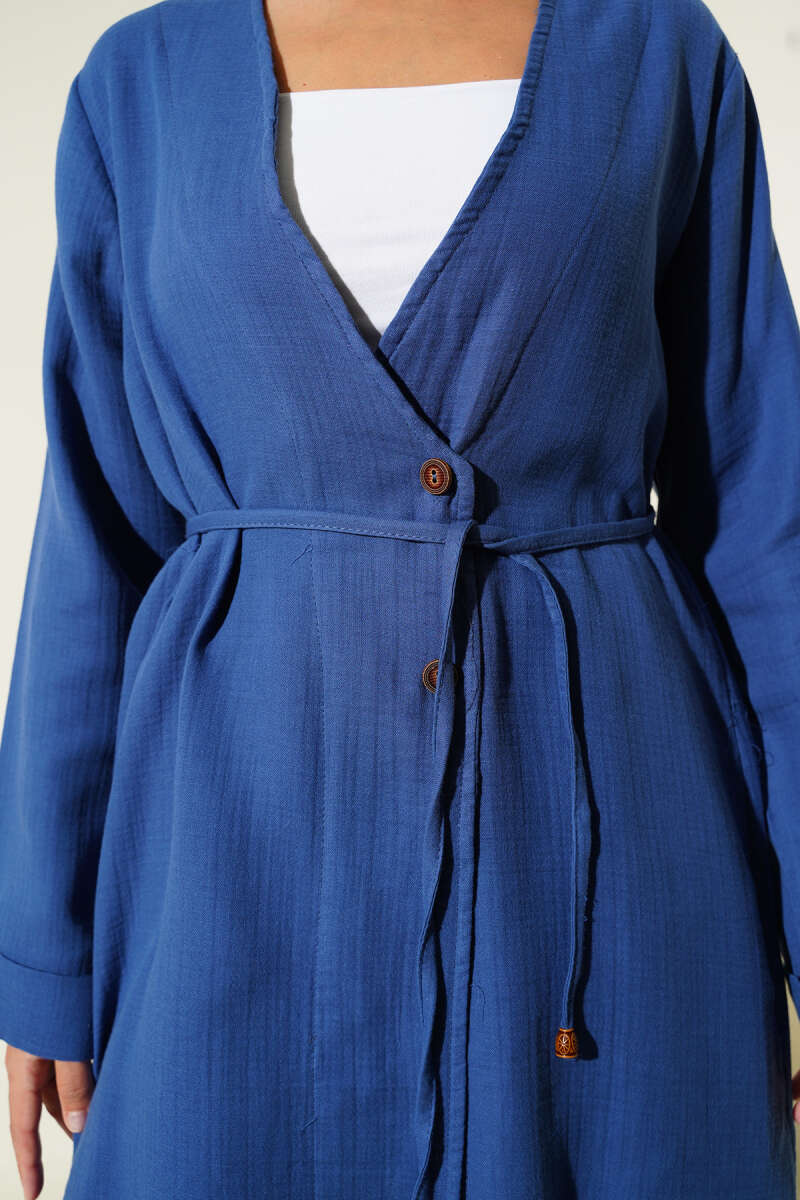 Düğmeli İp Kuşaklı Müslin İkili Takım Indıgo