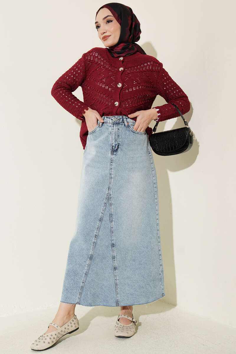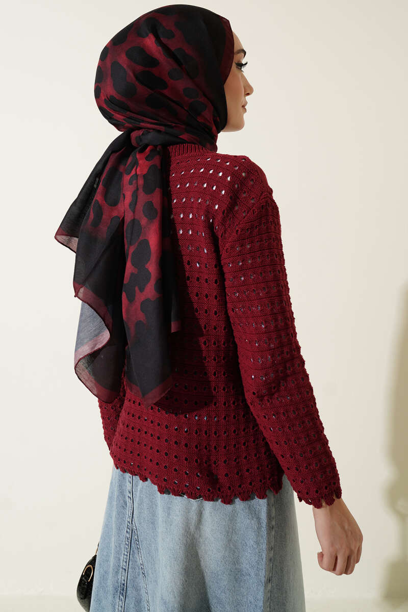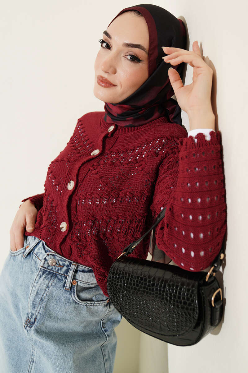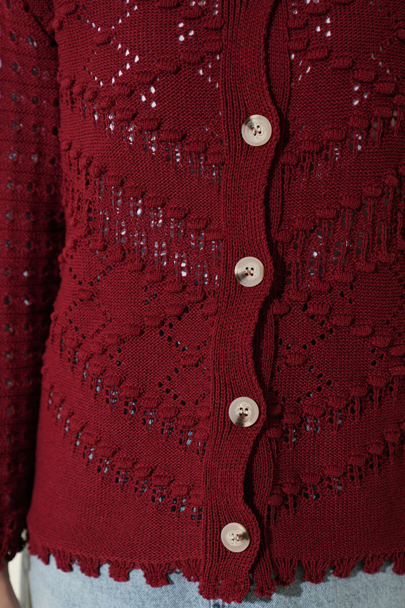 Düğmeli Kabartma Detaylı Kısa Ajurlu Hırka Bordo