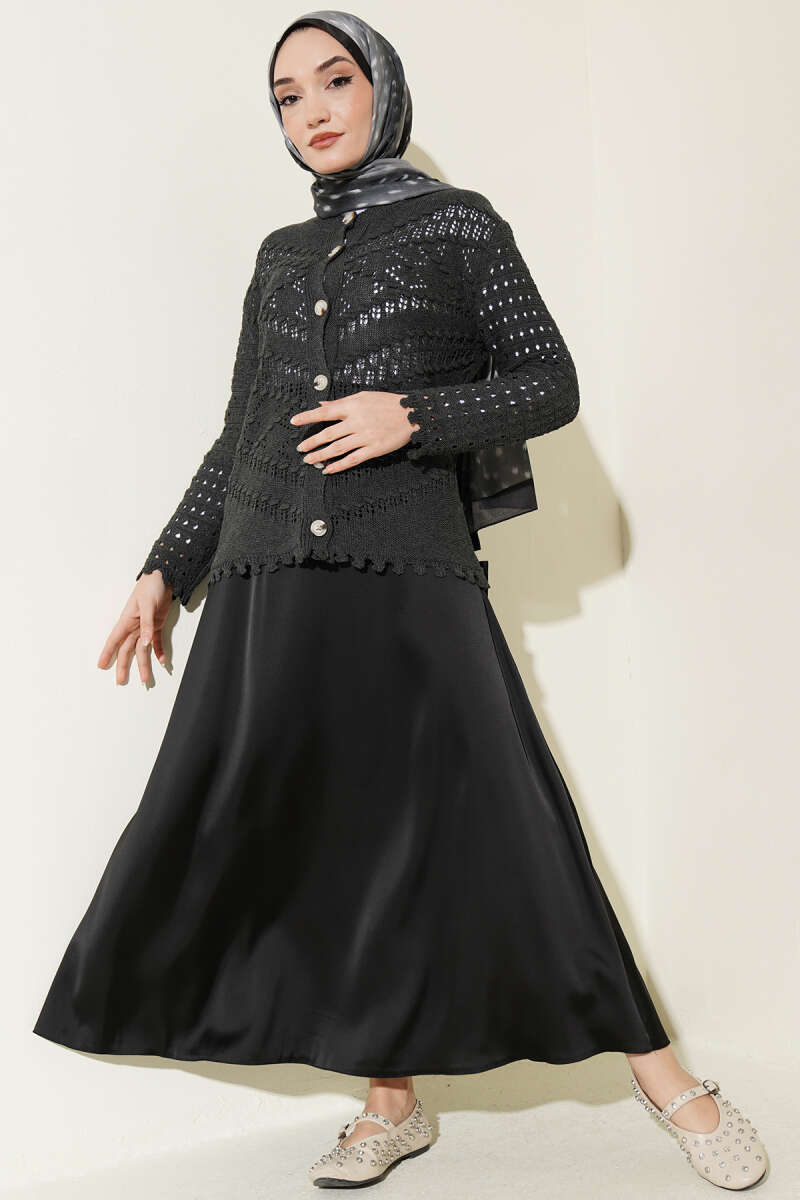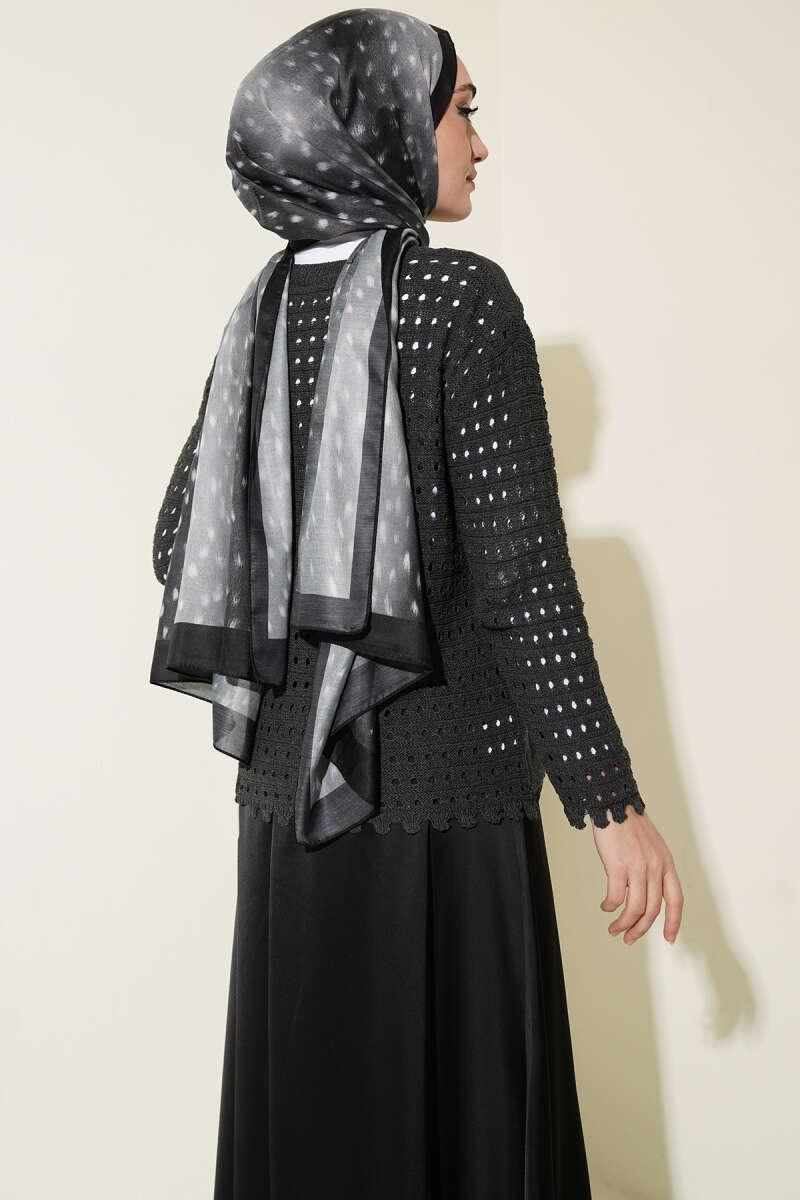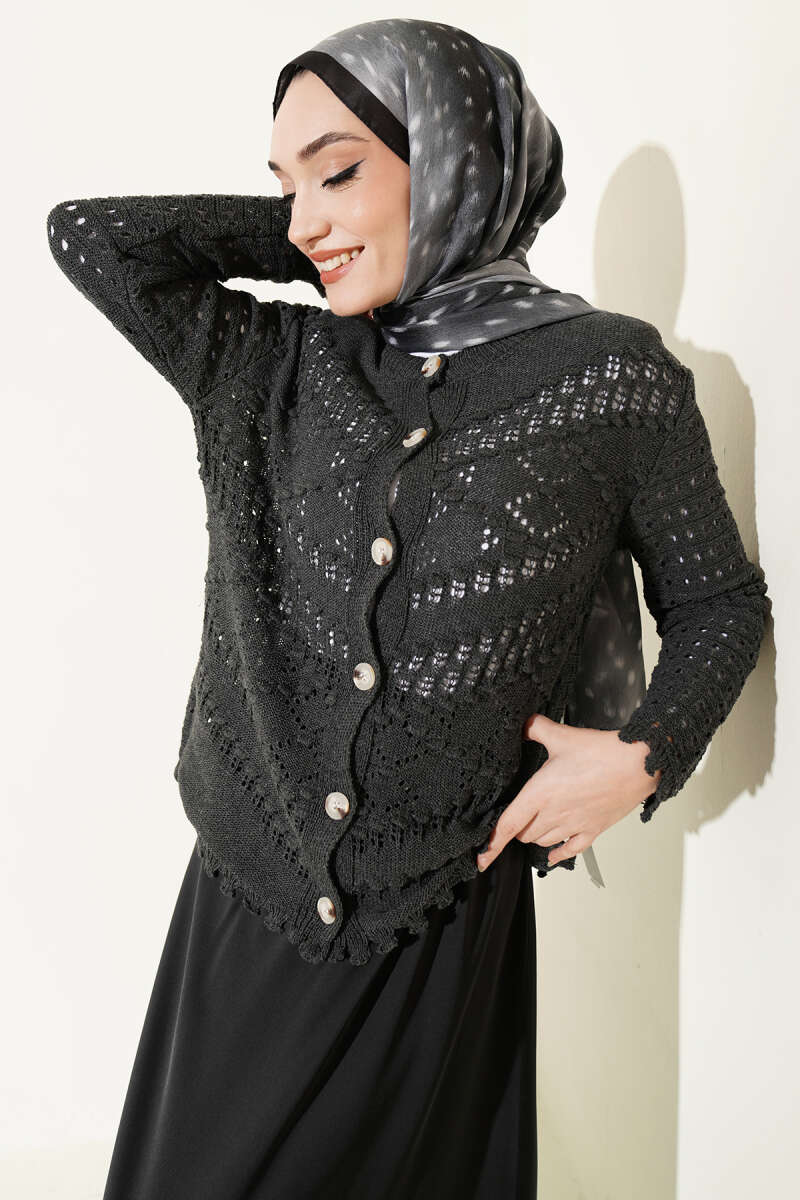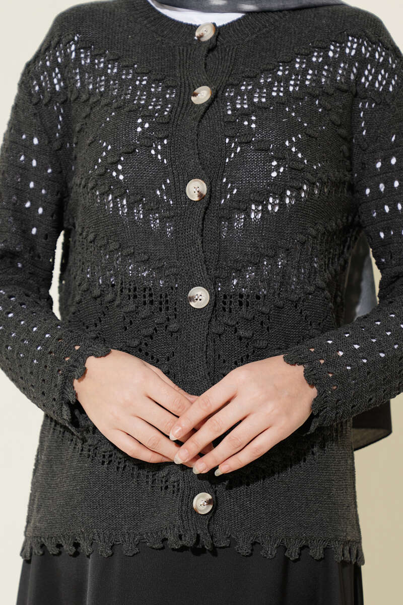 Düğmeli Kabartma Detaylı Kısa Ajurlu Hırka Füme