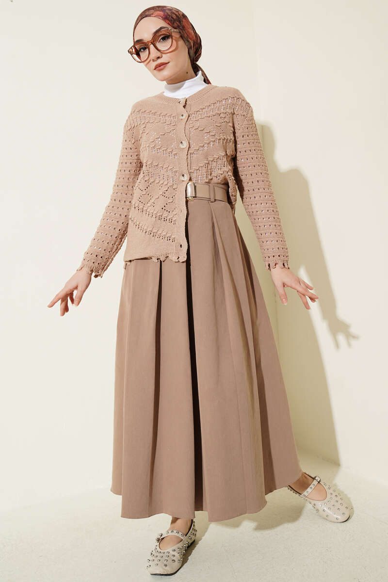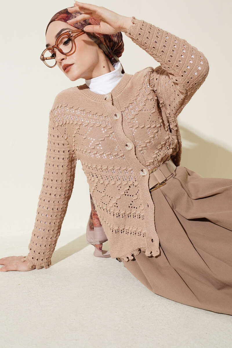 Düğmeli Kabartma Detaylı Kısa Ajurlu Hırka Latte