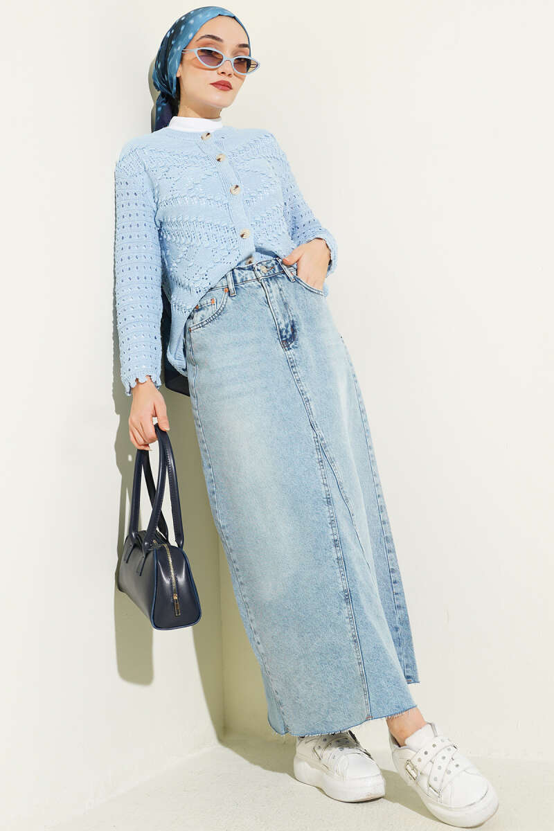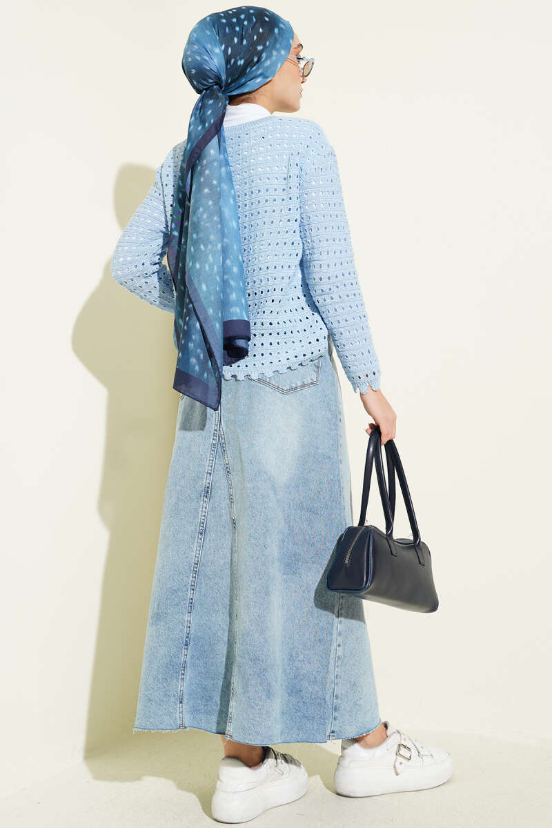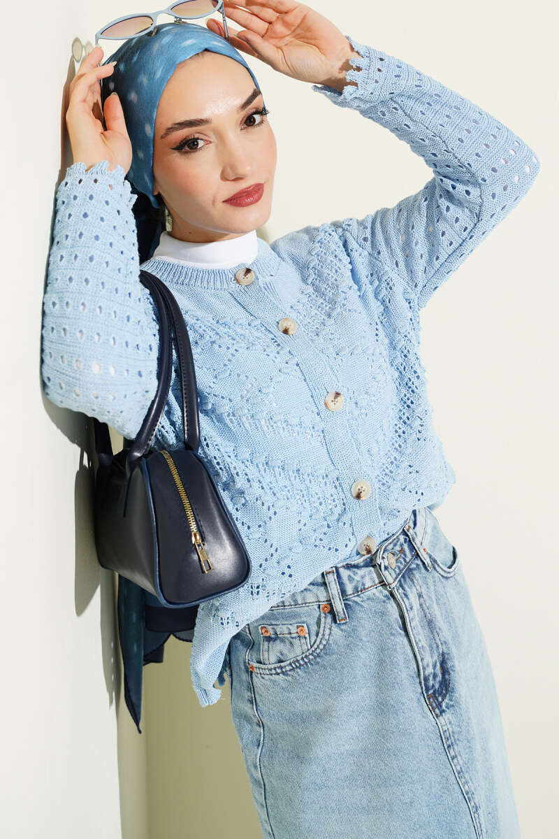 Düğmeli Kabartma Detaylı Kısa Ajurlu Hırka Mavi
