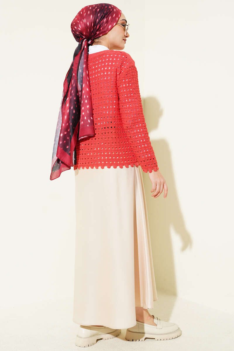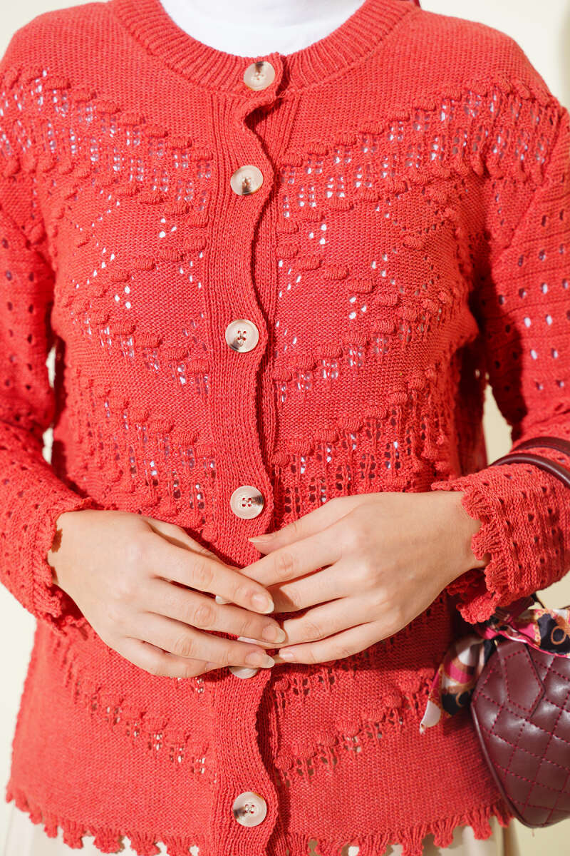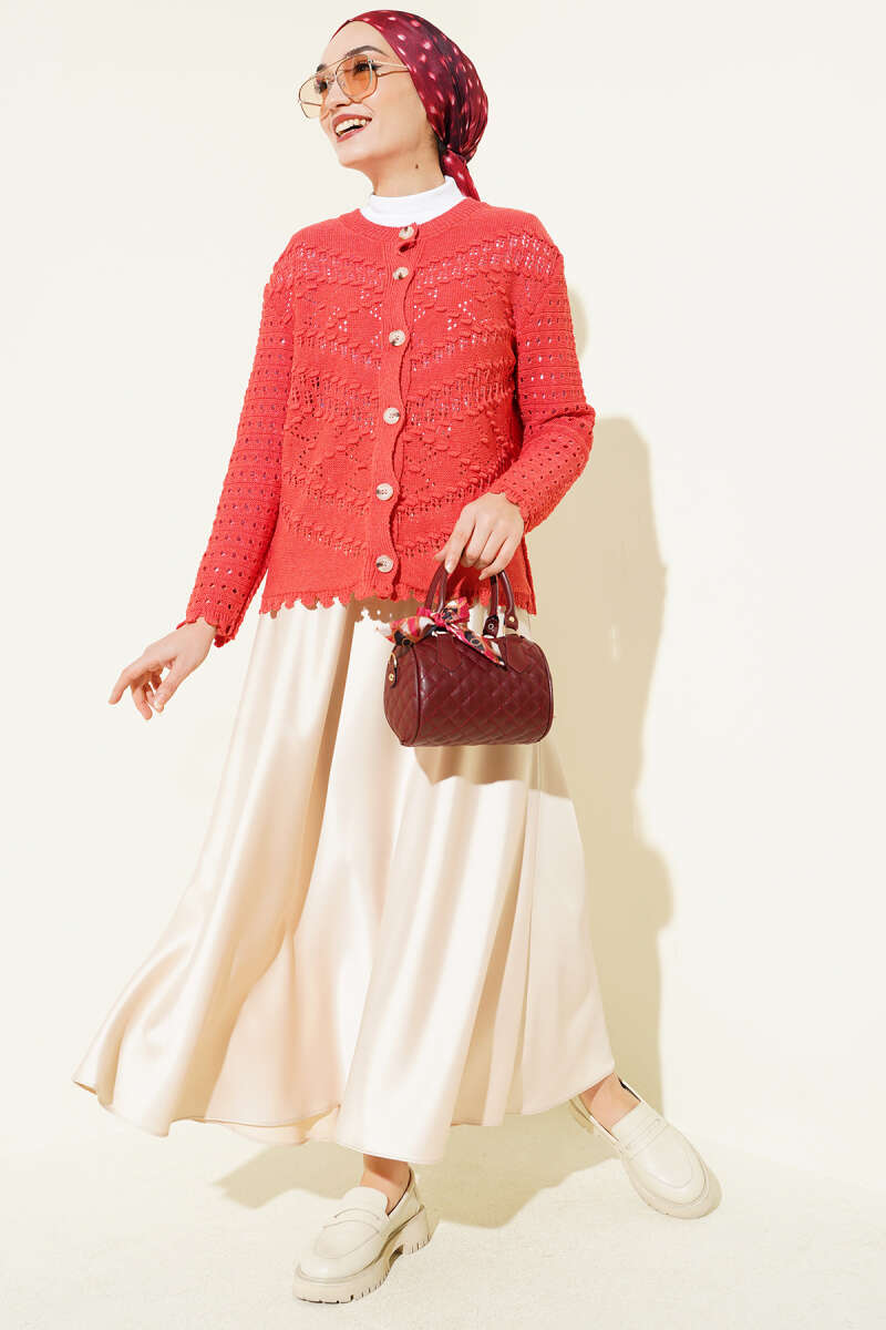Ön kısmında yer alan şık düğmeleri ve modern kısa kesimi, vücut hatlarını dengeleyerek dinamik ve feminen bir silüet oluşturur. Etek ucundaki hafif dalgalı bitişler ve nefes alan dokusu sayesinde, hem jean eteklerle hem de kumaş pantolonlarla mevsim geçişlerinde konforlu bir şıklık yakalamanıza yardımcı olur.
