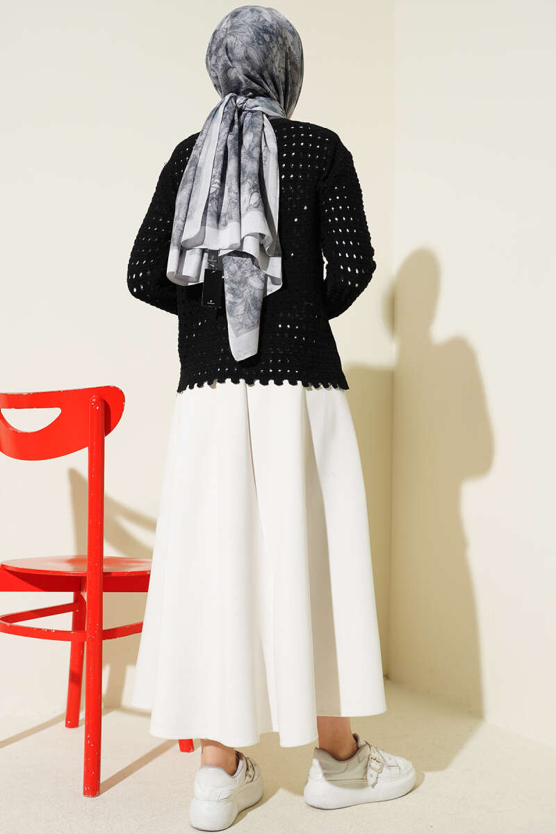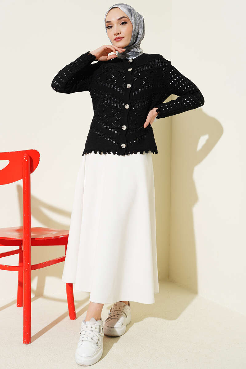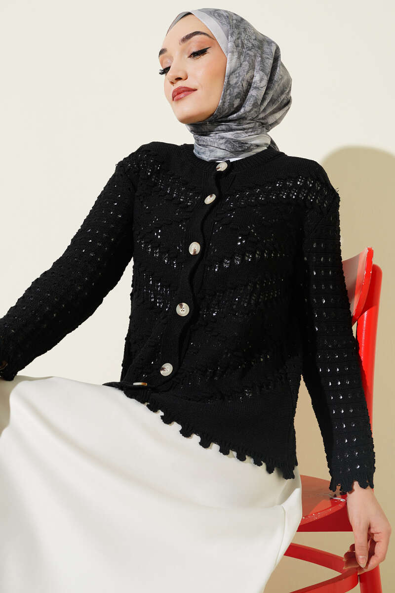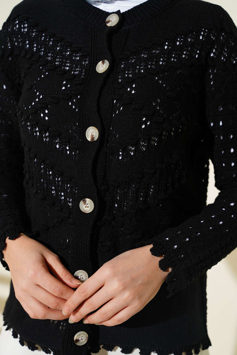 Düğmeli Kabartma Detaylı Kısa Ajurlu Hırka Siyah