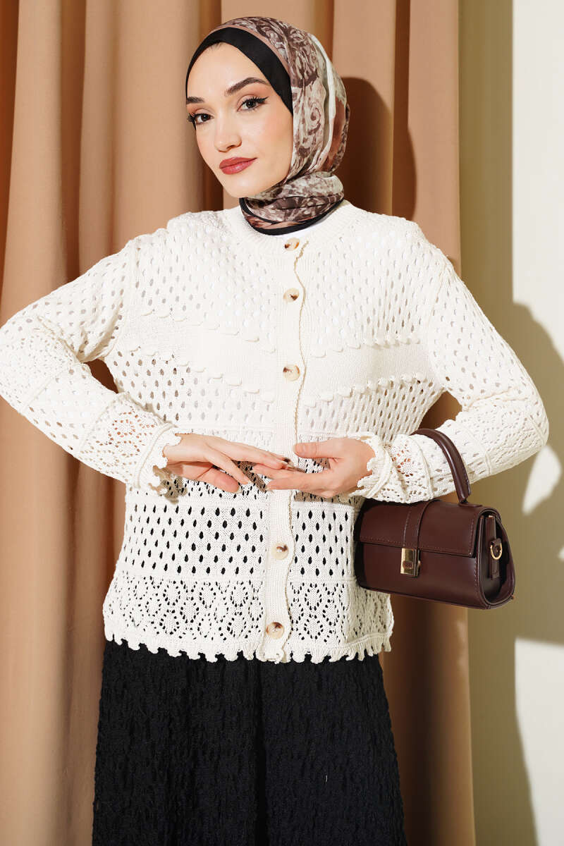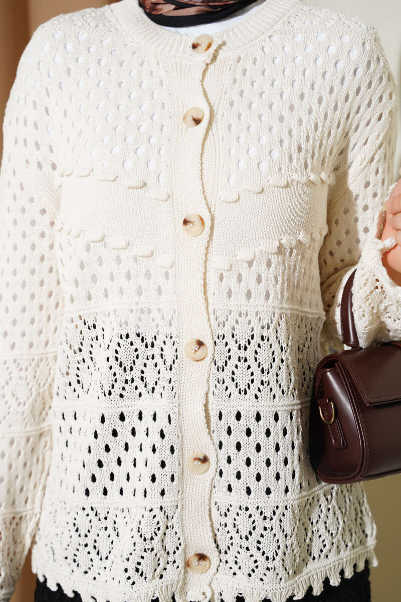 Düğmeli Kabartmalı Kısa Triko Hırka Ekru