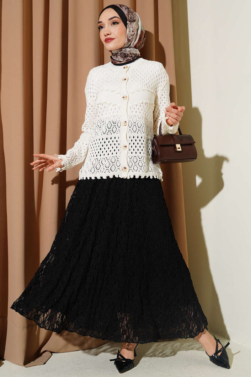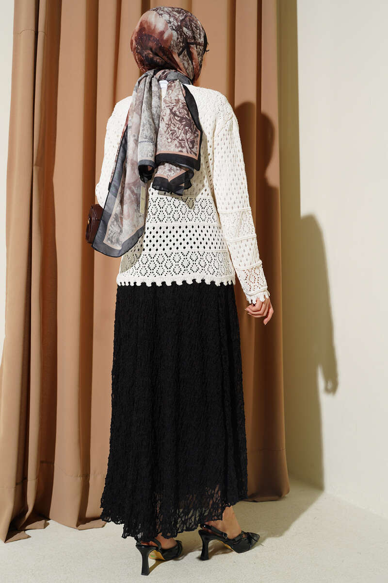 Zarif kabartma motifleri ve ajurlu dokusuyla ön plana çıkan bu kısa triko hırka, romantik bir stilin anahtar parçasıdır. Ön kısmındaki düğme detayları ve yuvarlak yaka kesimiyle klasik bir görünüm sunarken, kollarındaki volanlı bitişler tasarıma feminen bir hava katar. Hafif ve nefes alan triko yapısı sayesinde mevsim geçişlerinde ideal bir konfor sağlar ve yüksek bel eteklerle şık bir uyum yakalar.