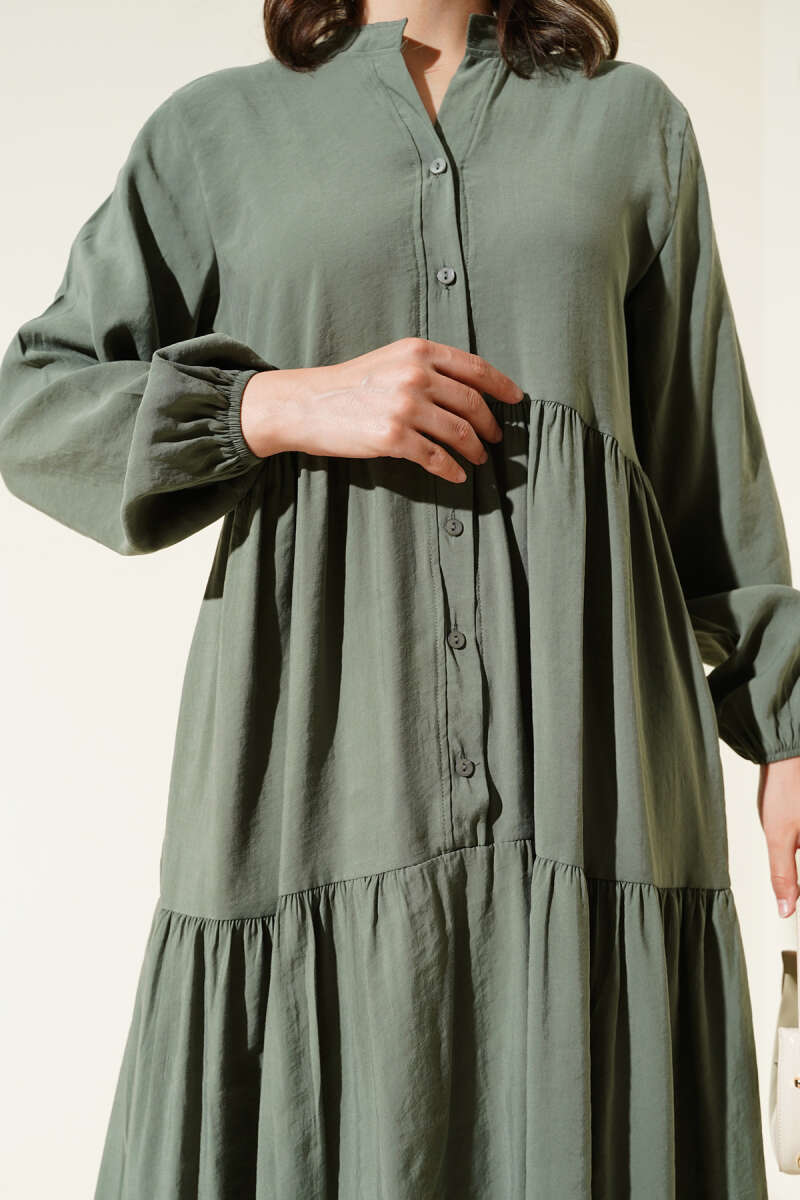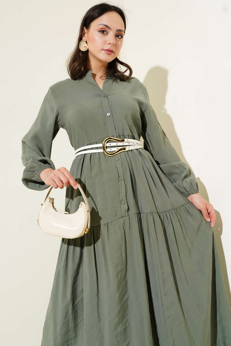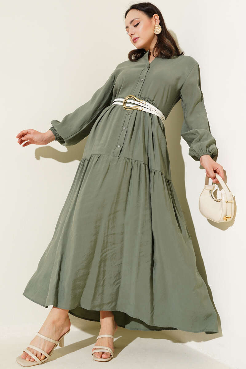 Kolları Coton Beli Büzgülü Kahve Elbise
