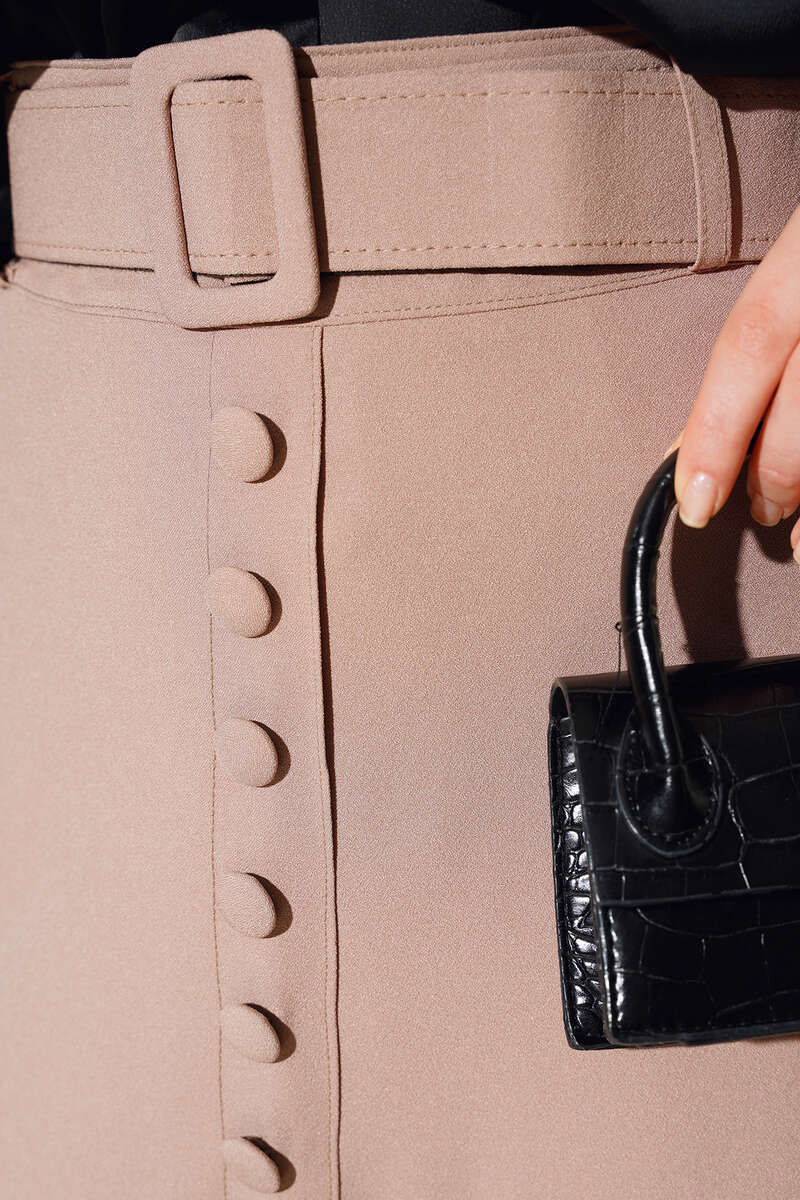 Yeni sezon eteğimiz şık bir kombin için tamamlayıcı parça olacaktır. Kloş model eteğimizin beli kemerlidir. Dört adet kemer köprüsü bulunan eteğimizin beli fermuarlıdır. İçi astarlıdır. Önü düğmeli etek modelimizin renk seçenekleri mevcuttur.