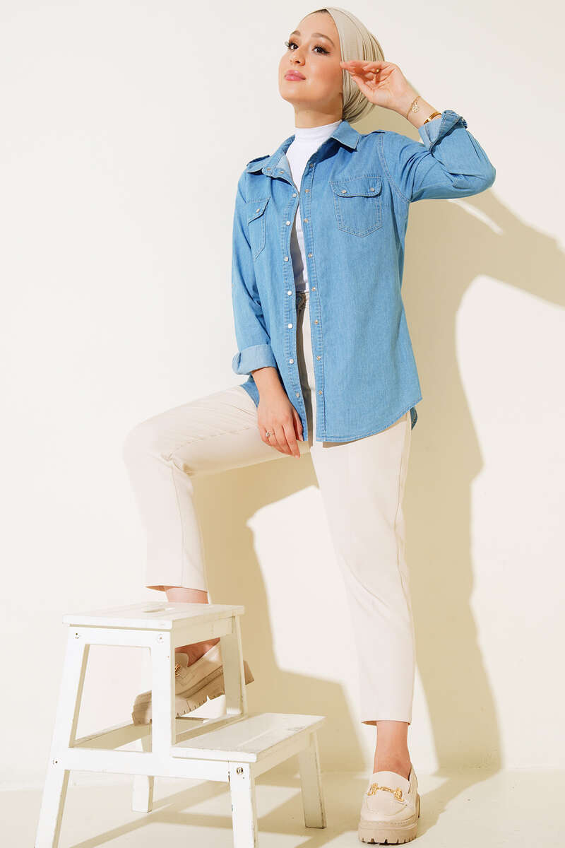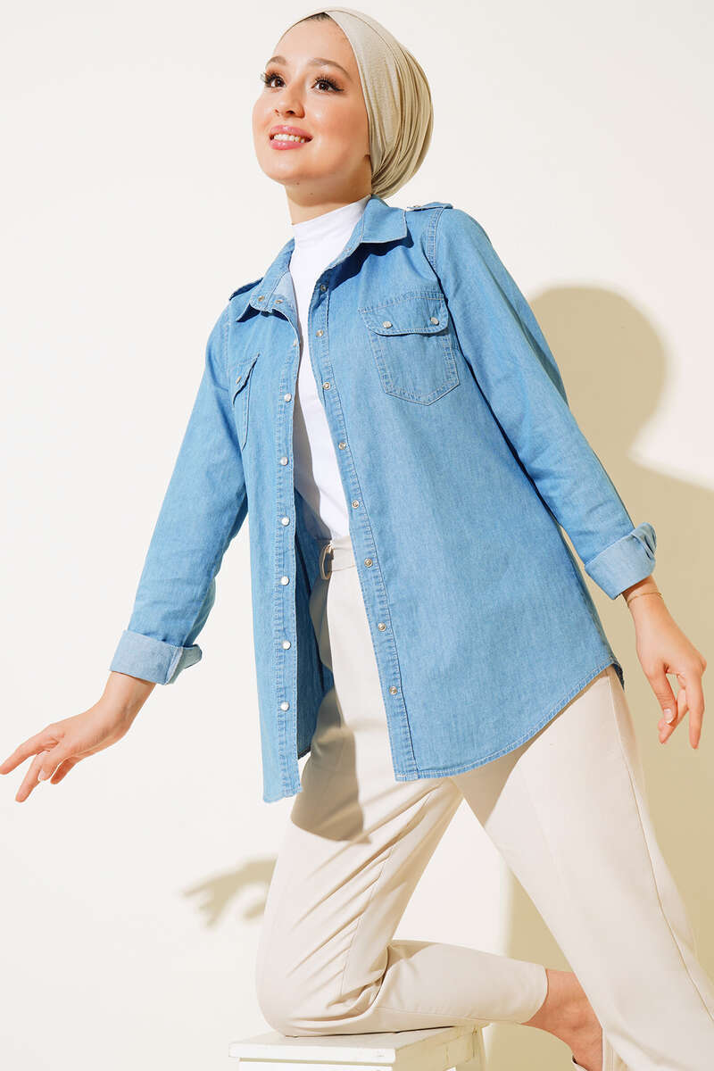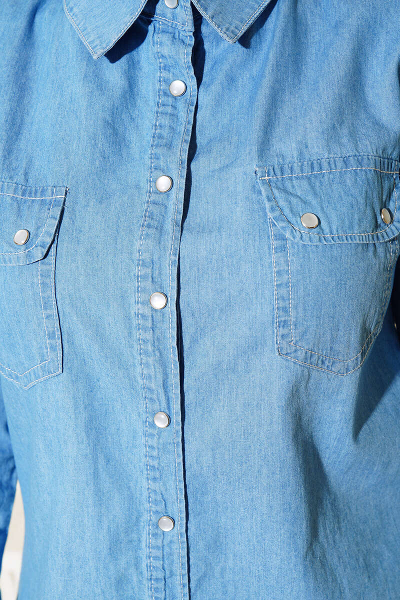 Önü boydan gizli düğmeli olan kot tuniğin bilek kısmıda düğme detaylıdır.  Oldukça yumuşak ve rahat tunik salaş bir kesime sahiptir. Günlük kombinlerinizde rahatlıkla kullanabilirsiniz.