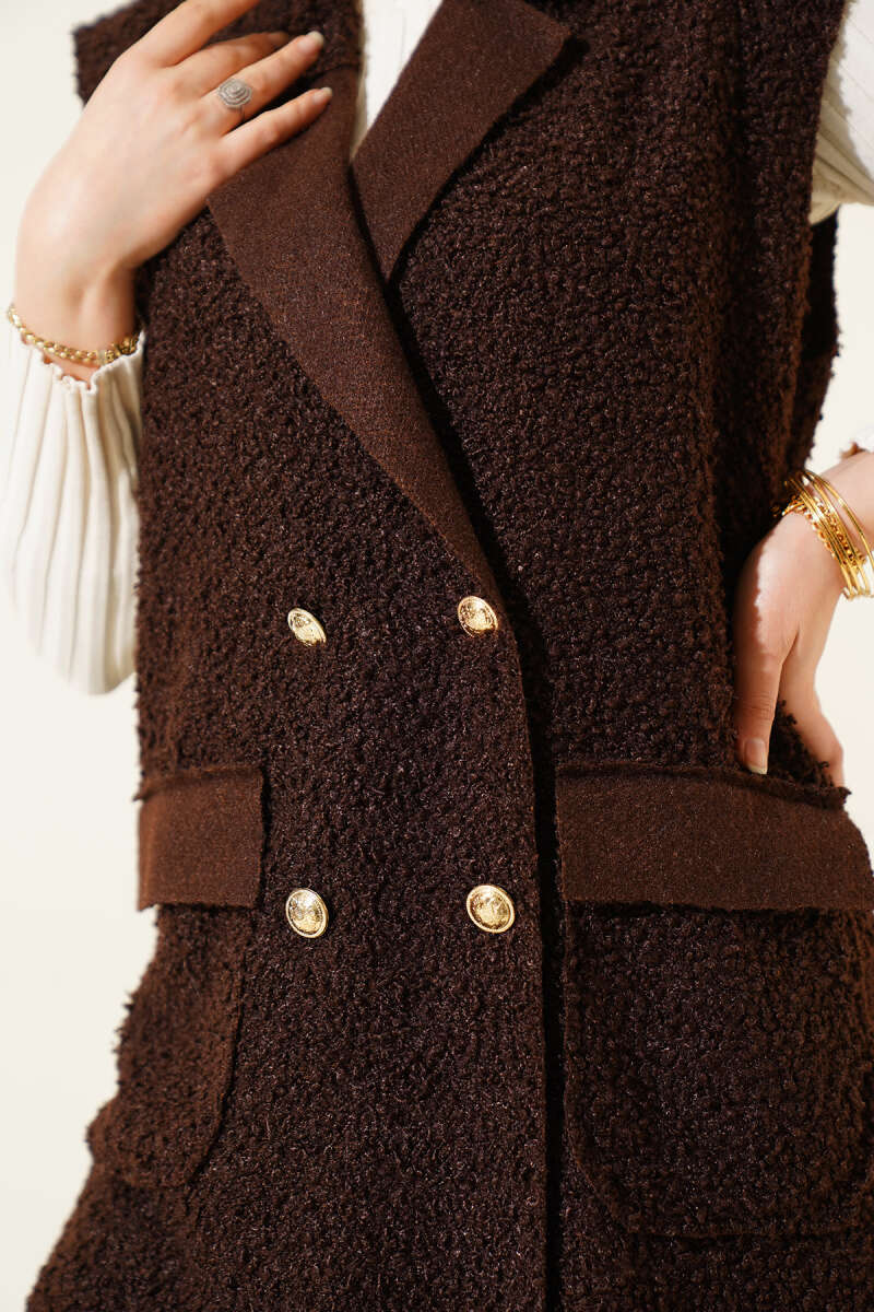 Düğmeli Kruvaze Yaka Buklet Yelek Bej