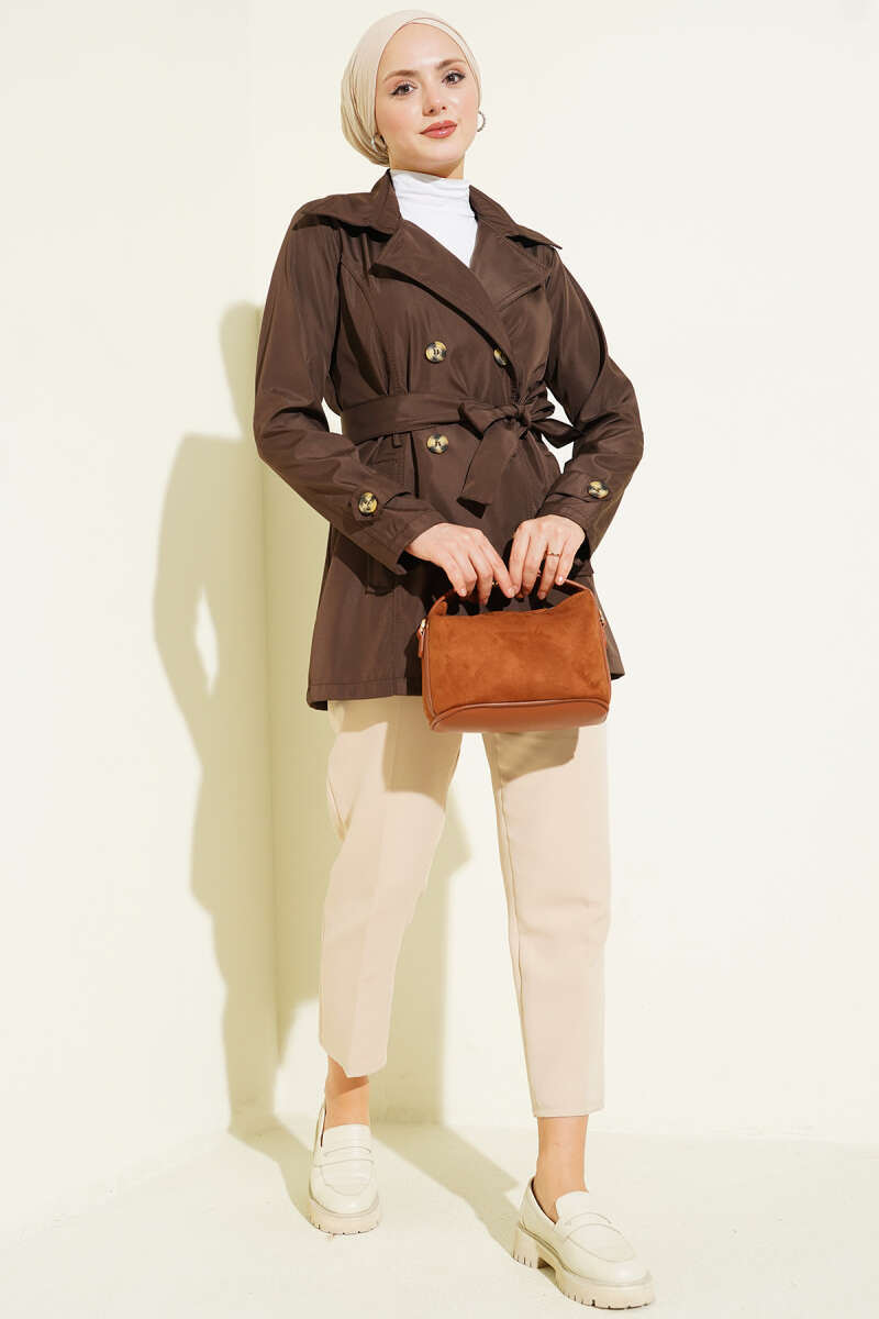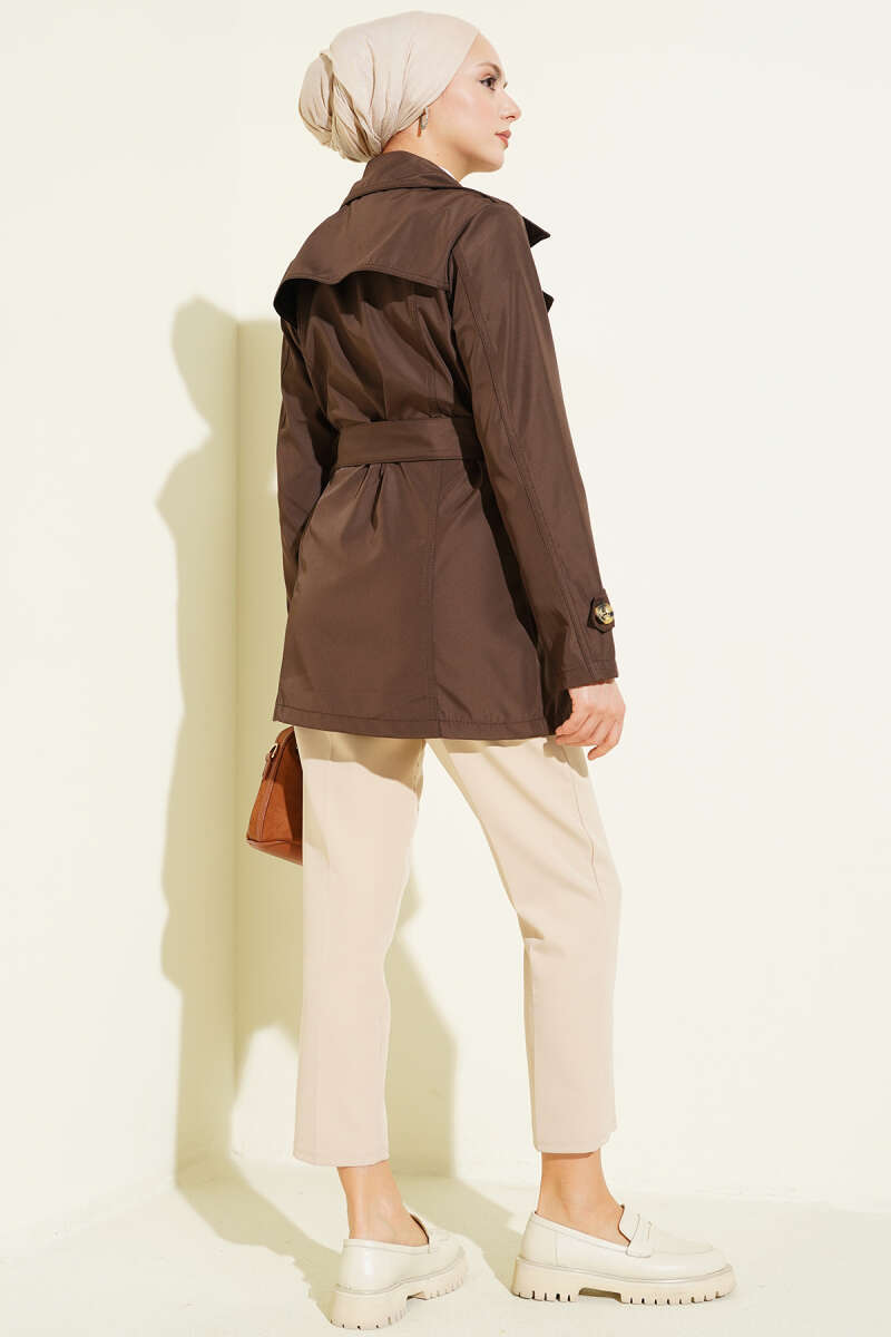 Düğmeli Kruvaze Yaka Kısa Trençkot Kahve