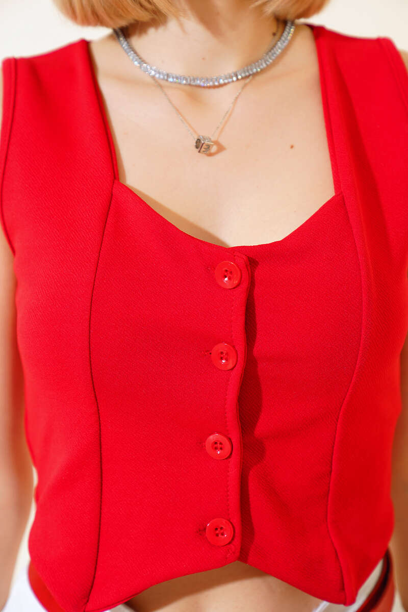 Yeni sezon kısa yelek modelimiz ince çizgilidir. Önü dört düğmeli olan yeleğimiz kombinlerinizde tamamlayıcı parça olarak görev üstlenmiştir. Dolabınızda muhakkak olması gereken yeleğimizin diğer renkleri de mevcuttur.