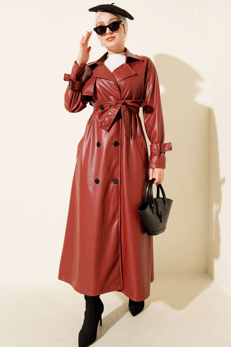 Etek Ucu Gizli Lastikli Leopar Trençkot Mürdüm