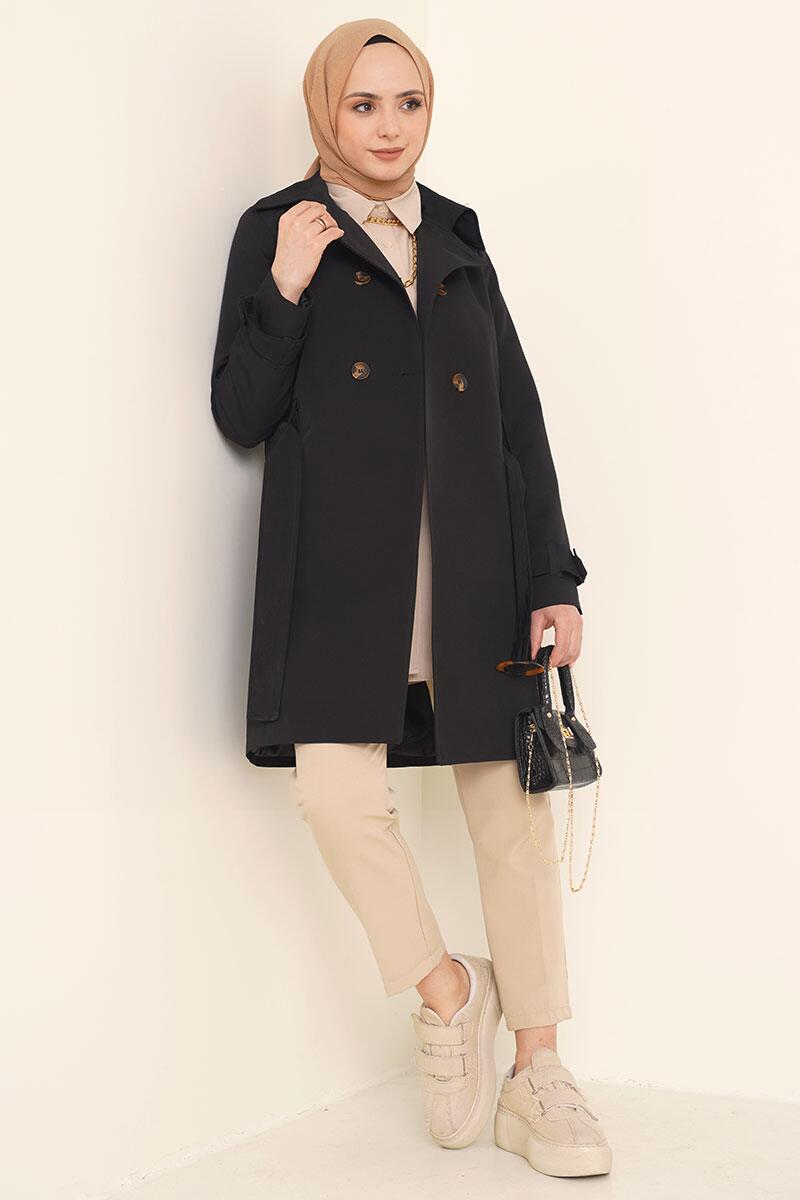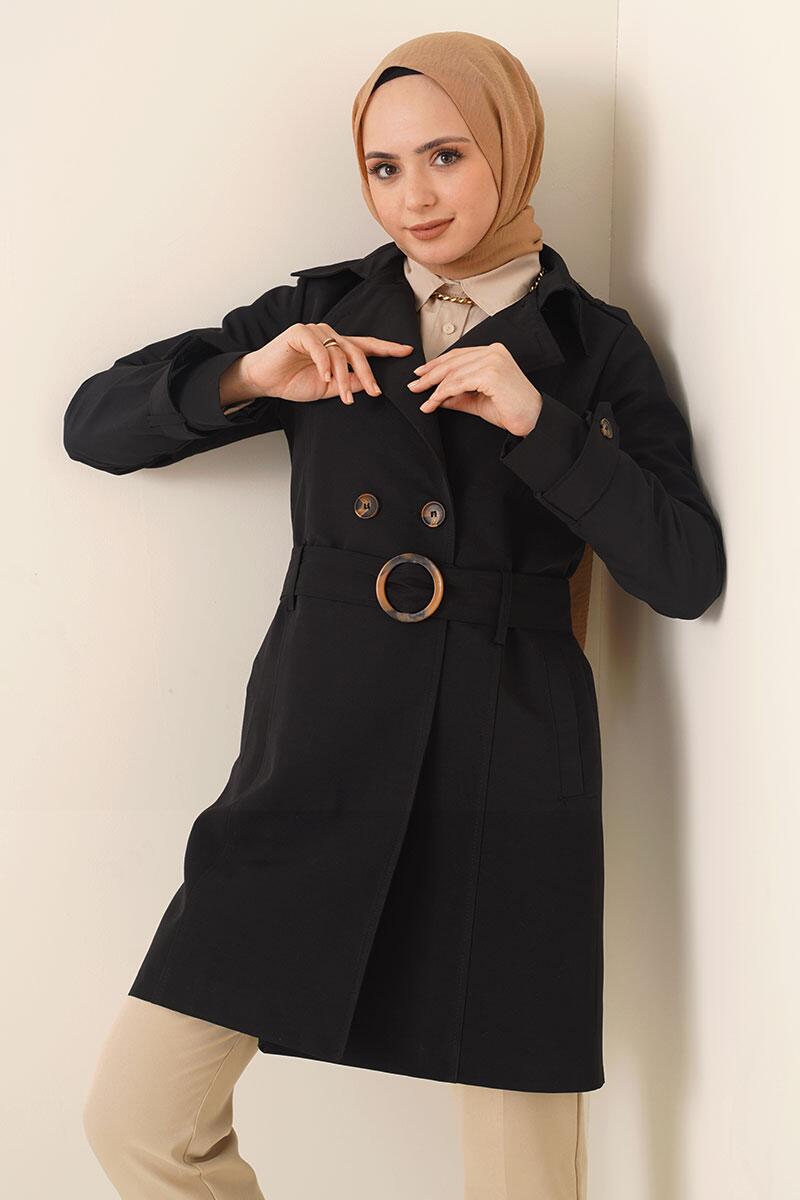 Siyah renkli trençkot yeni sezon modeldir. Düğmelidir. Çift fleto ceplidir. Dört tane kemer köprüsü bulunur. Kuşak trençkota dahildir. Renk alternatifi mevcuttur. İçi astarlıdır.