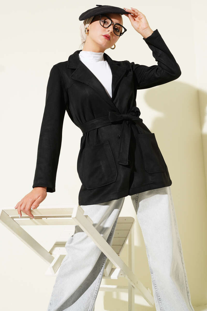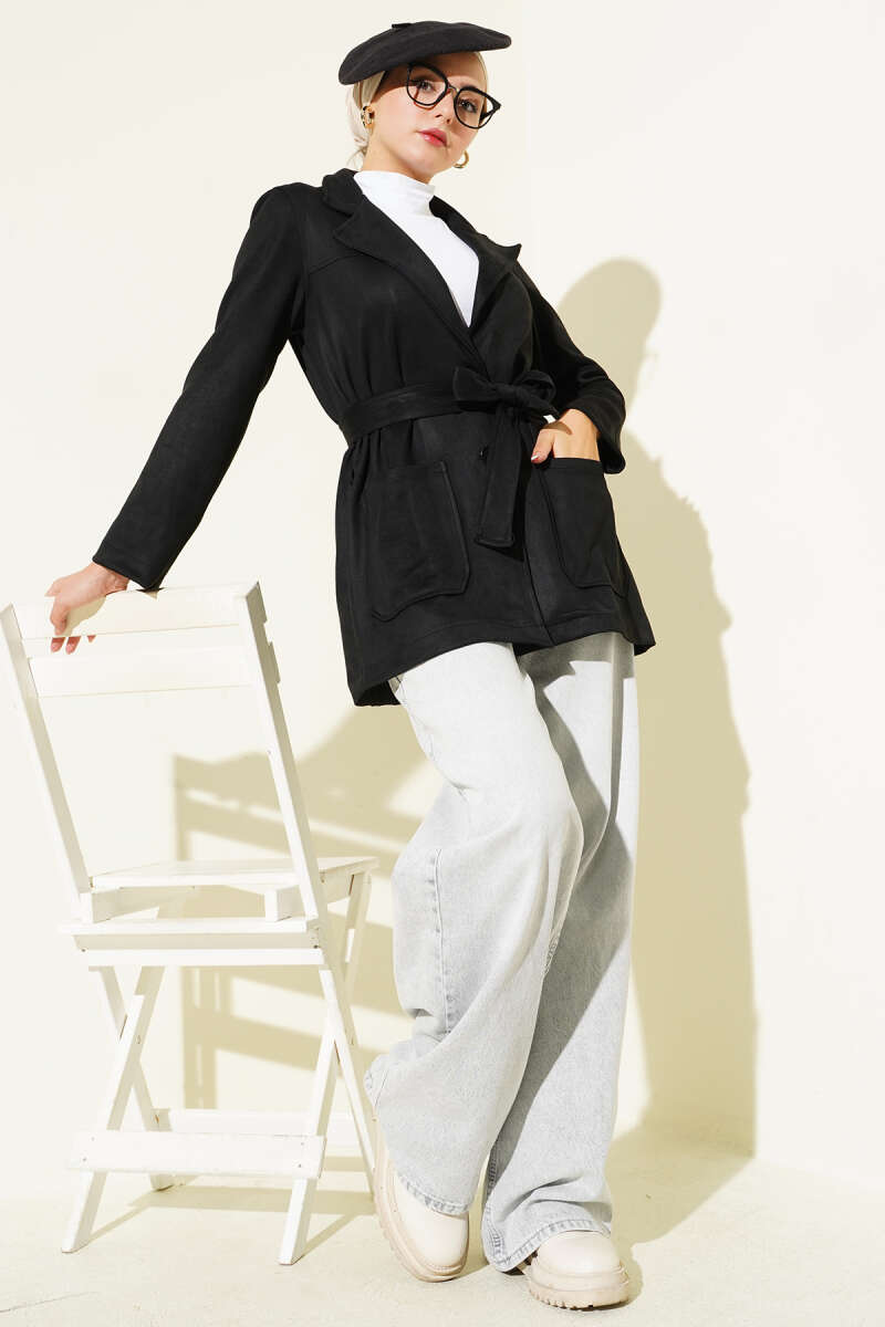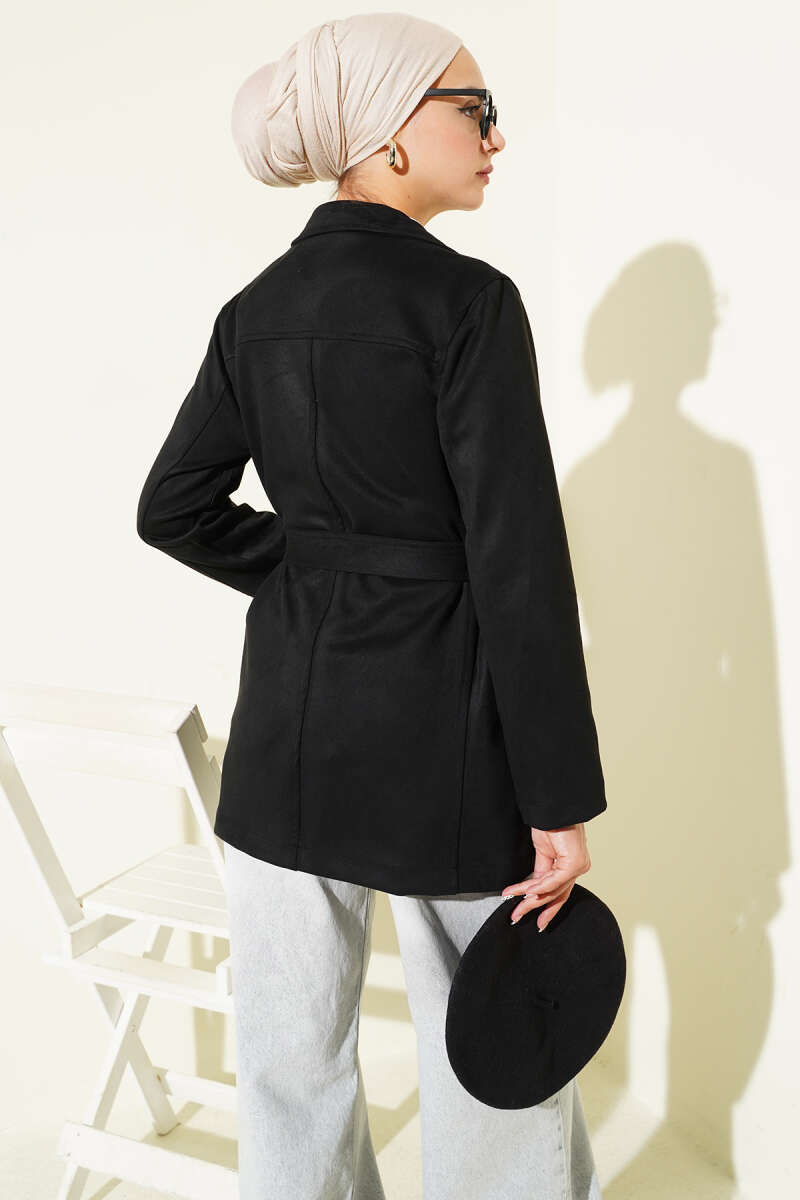 Kruvaze Yaka Belden Bağlamalı Kaban Siyah