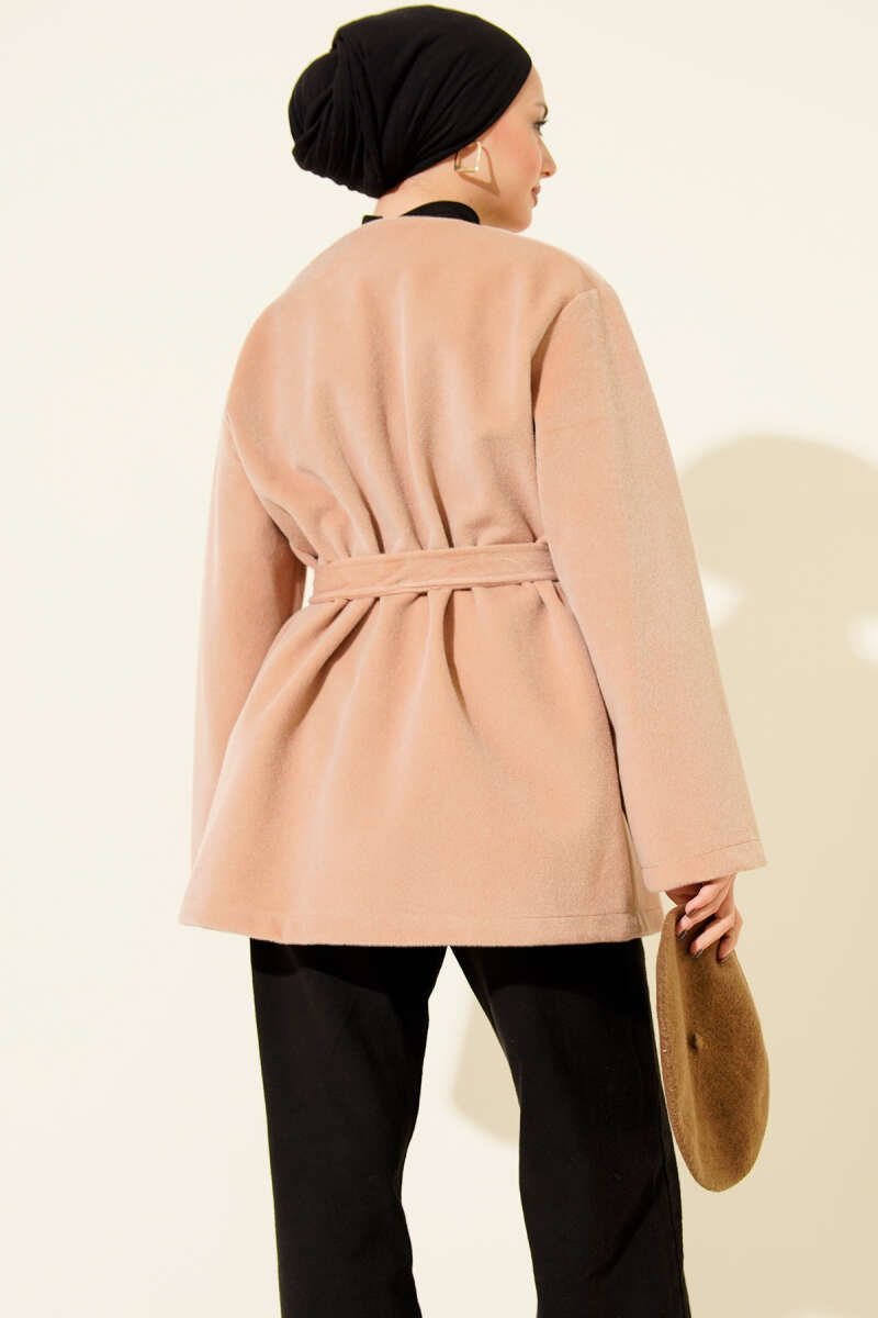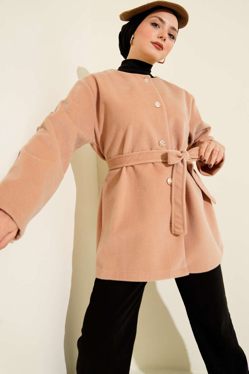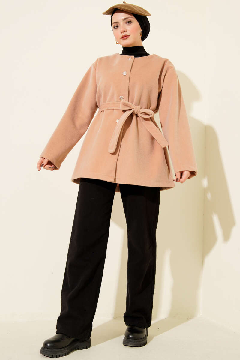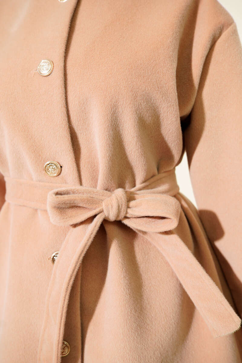Düğmeli Kuşaklı Tay Tüyü Ceket Latte