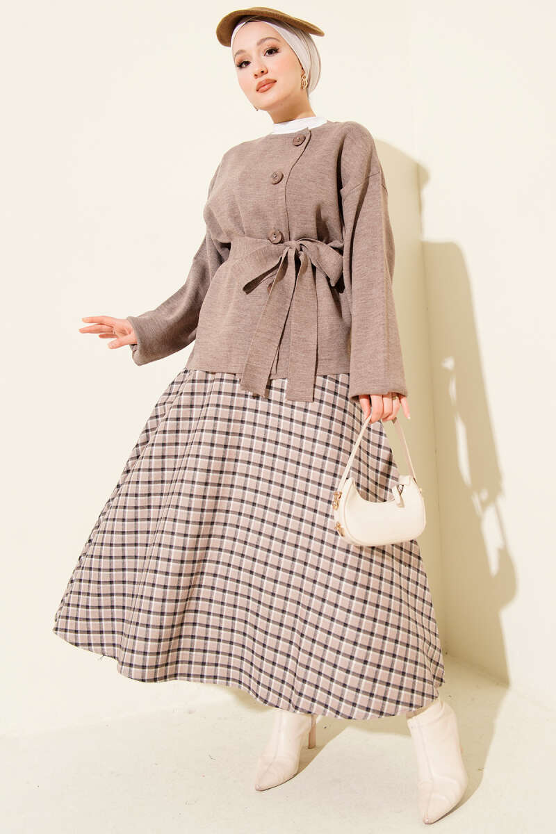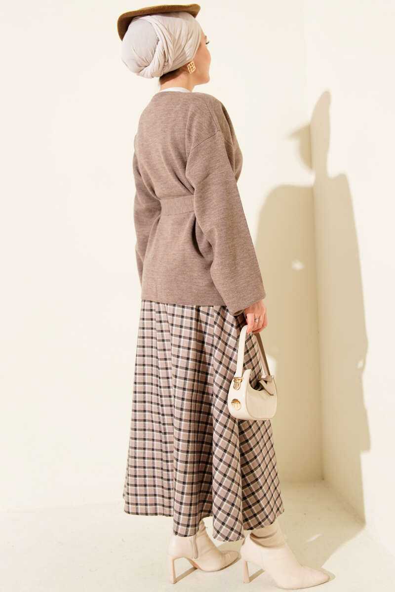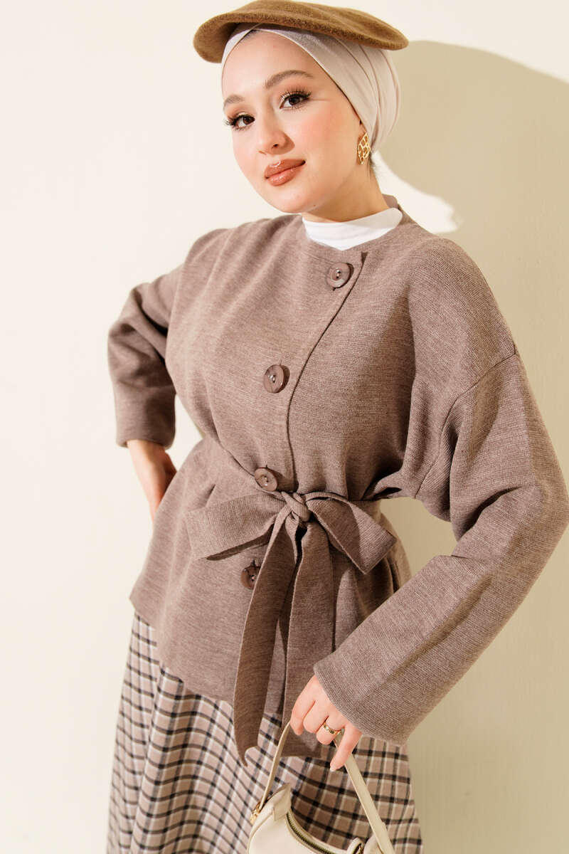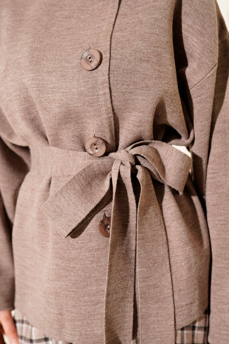 Düğmeli Kuşaklı Triko Hırka Kahve