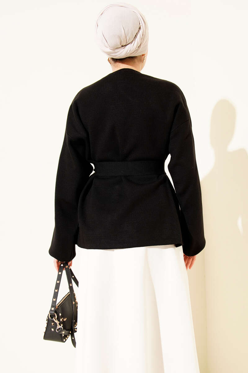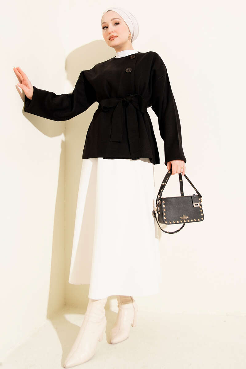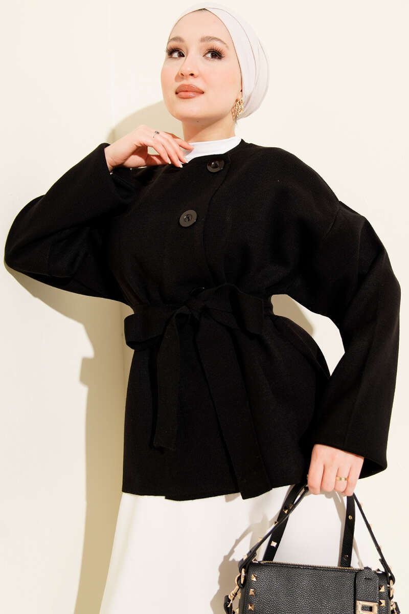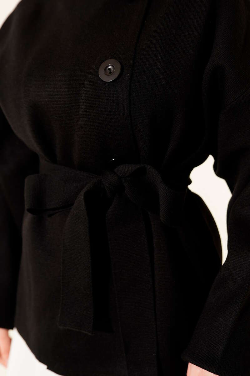 Deri Çıtçıtlı Sakallı Kuşaklı Ceket Siyah