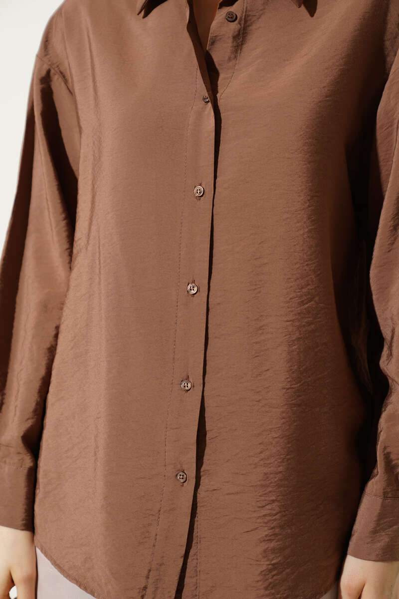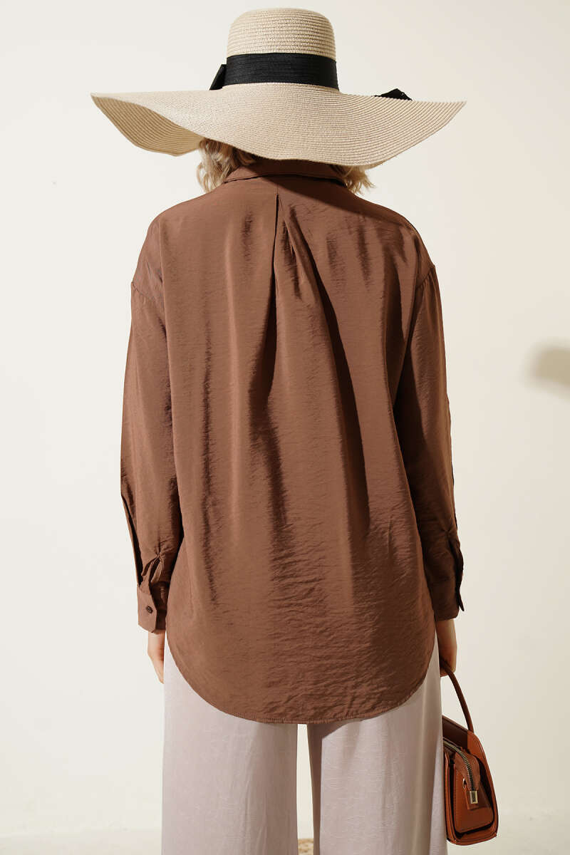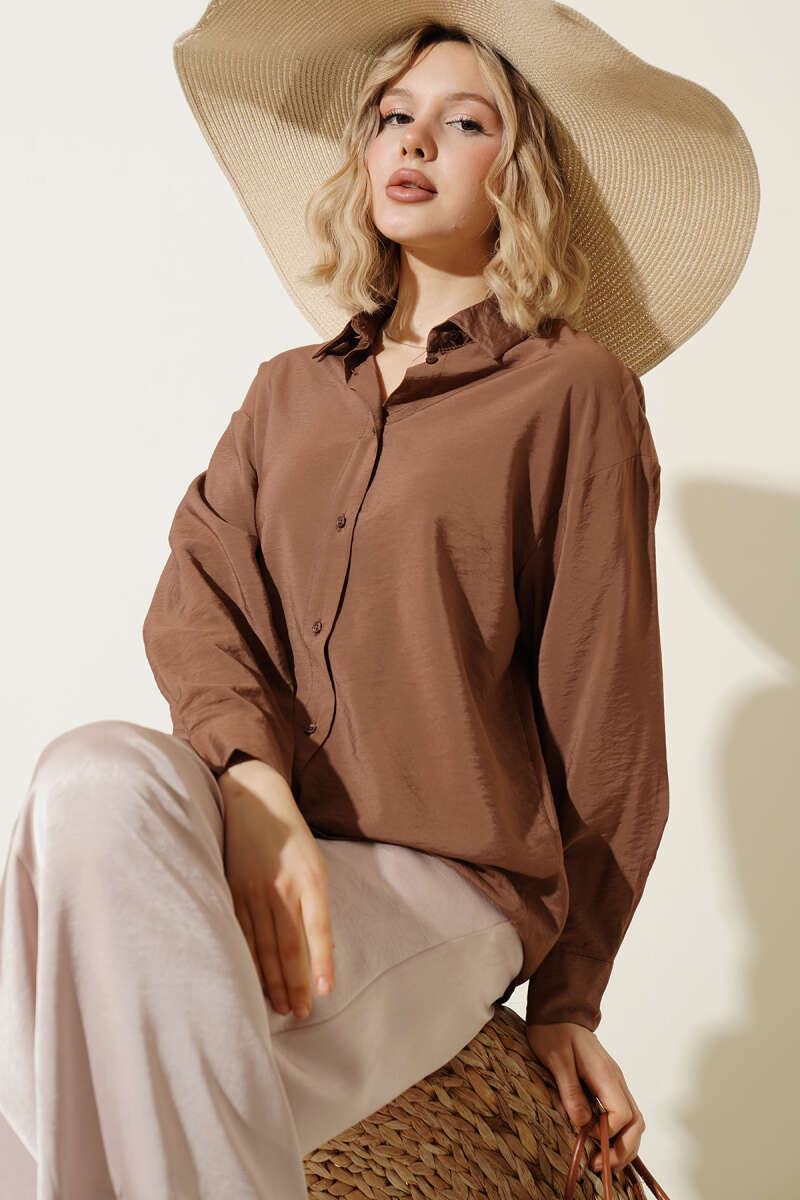 Hafif parlak dokusu ve ipeksi görünümüyle dikkat çeken bu gömlek, şıklığı ve konforu bir arada sunuyor. Klasik gömlek yakası ve düşük omuz kesimiyle modern bir silüet çizerken, geniş formu sayesinde gün boyu rahat bir hareket alanı vadediyor.