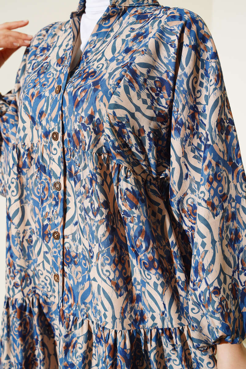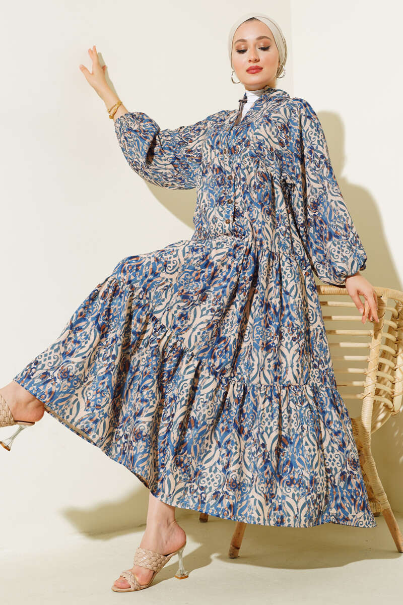 Paisley Desen Bel Lastikli Elbise İndigo