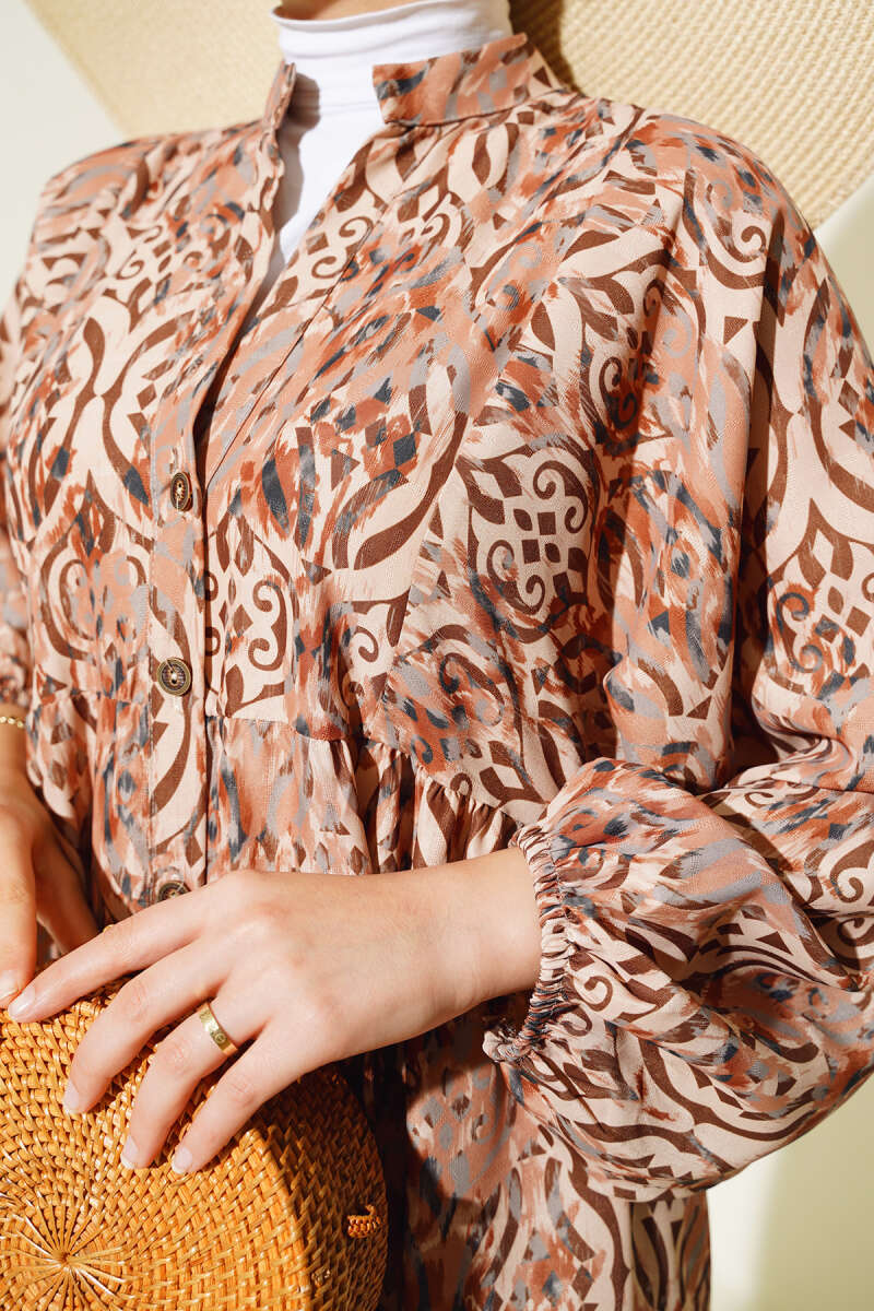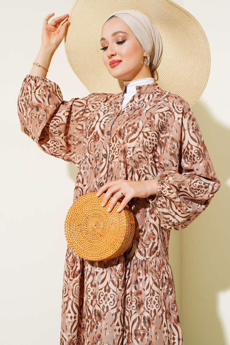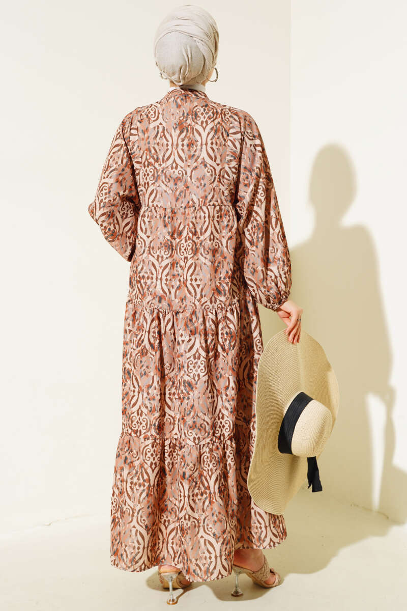 Paisley Desen Bel Lastikli Elbise Kahve