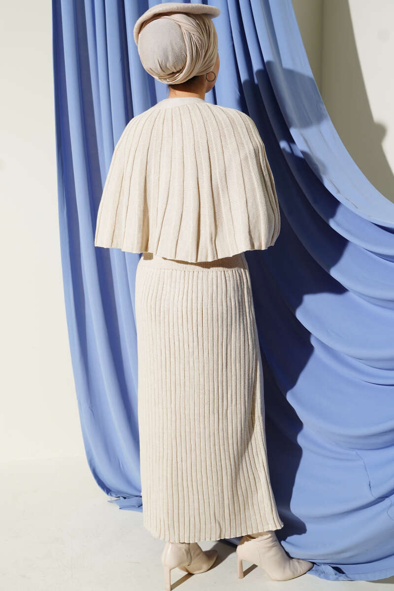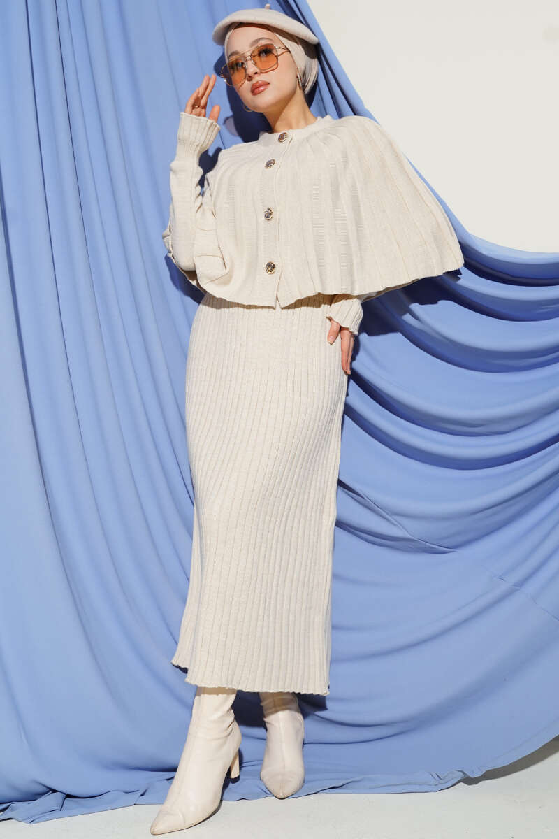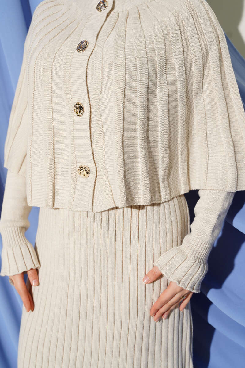 Düğmeli Pelerinli Triko Elbise Takım Vizon