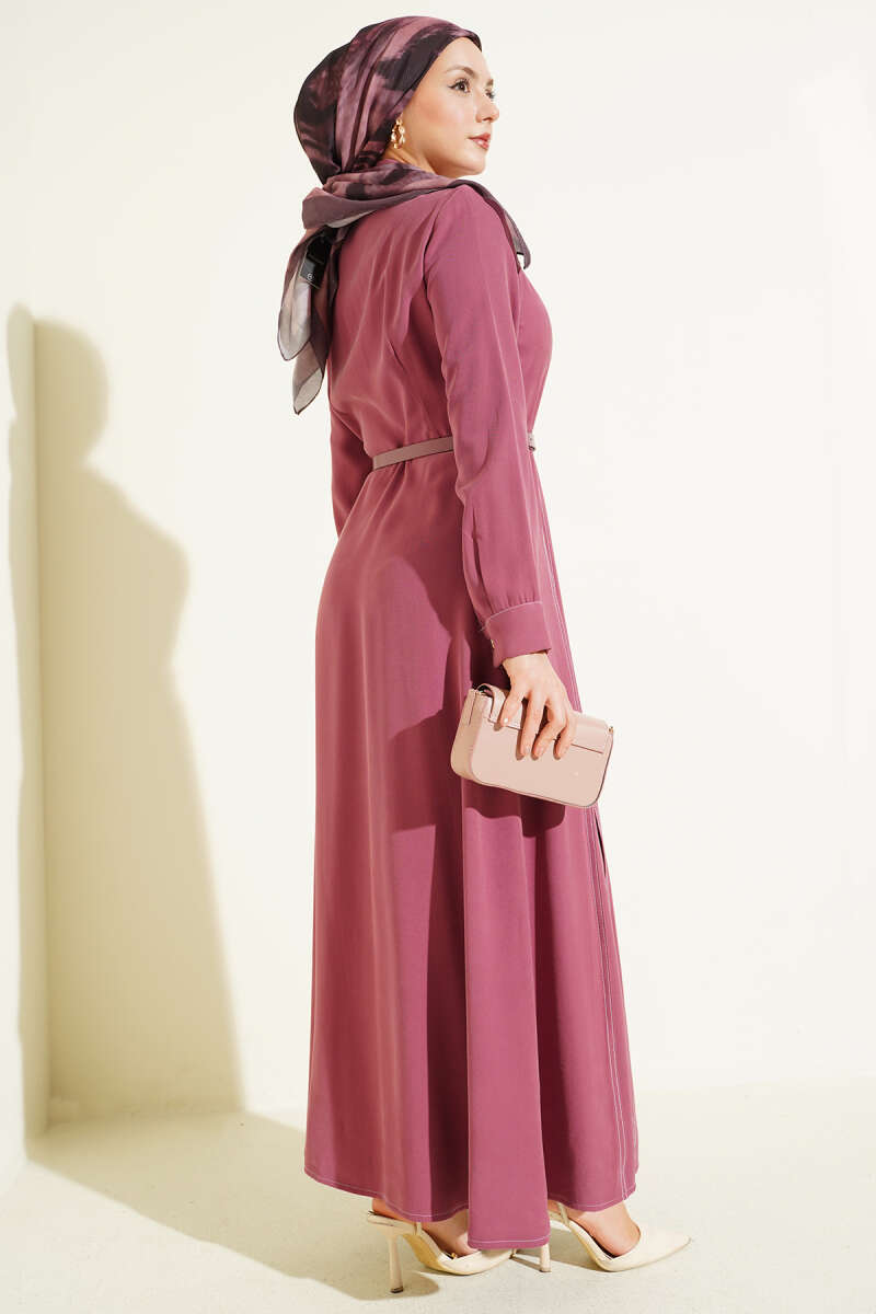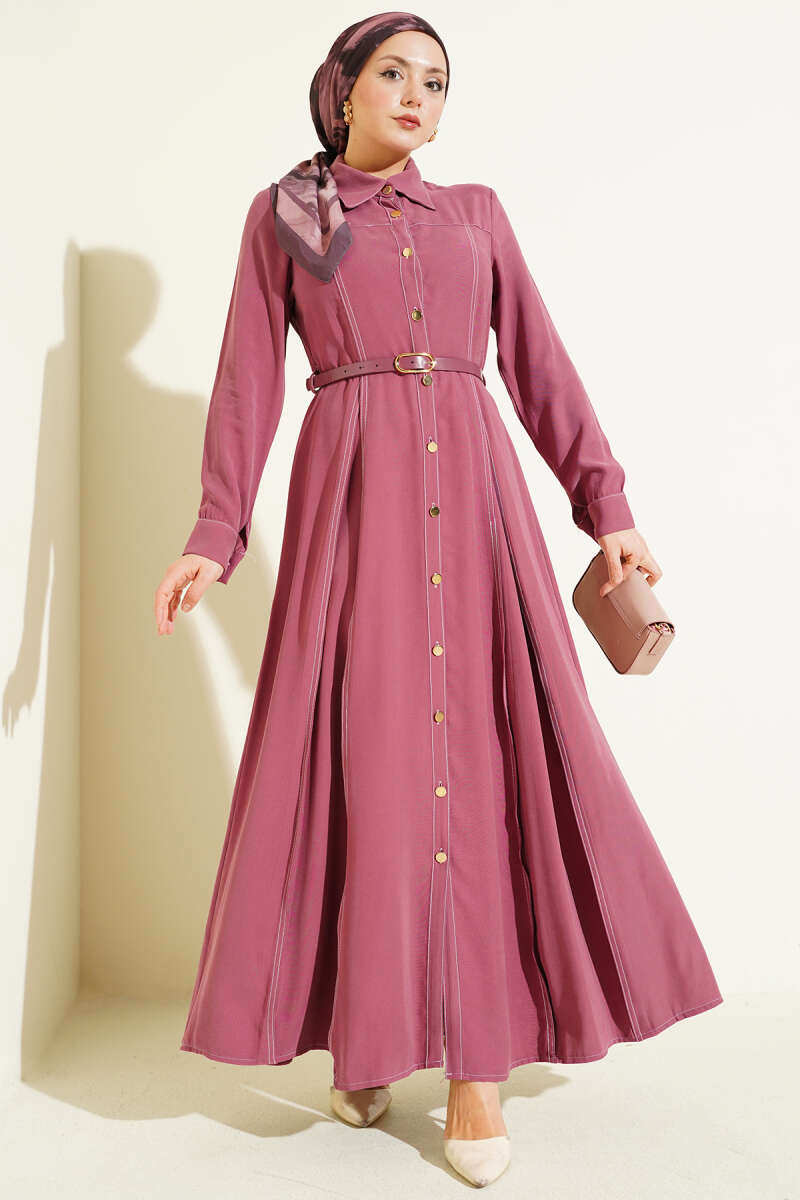 Düğmeli Pileli Kemerli Elbise Gül Kurusu