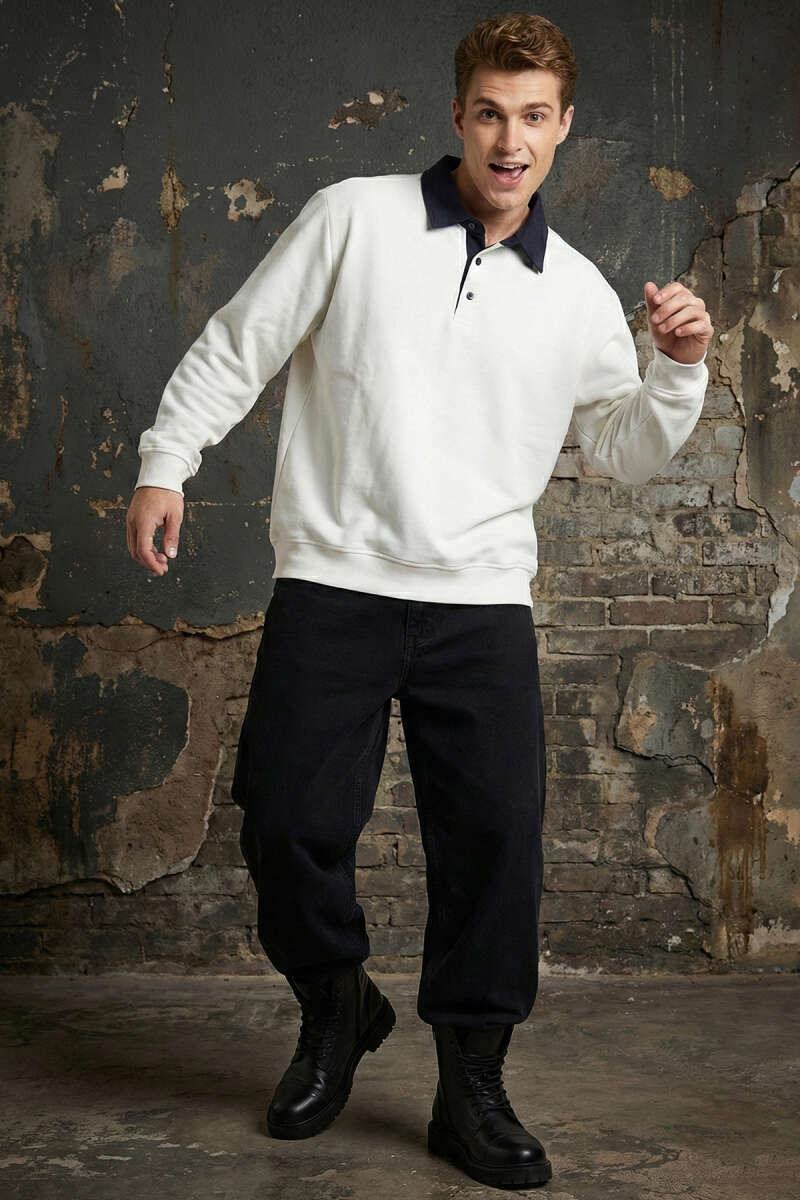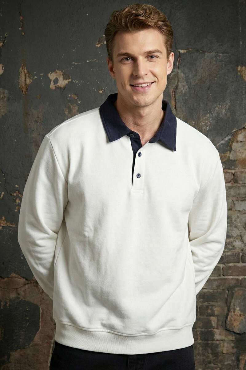 Düğmeli Polo Yaka Erkek Sweatshirt Beyaz
