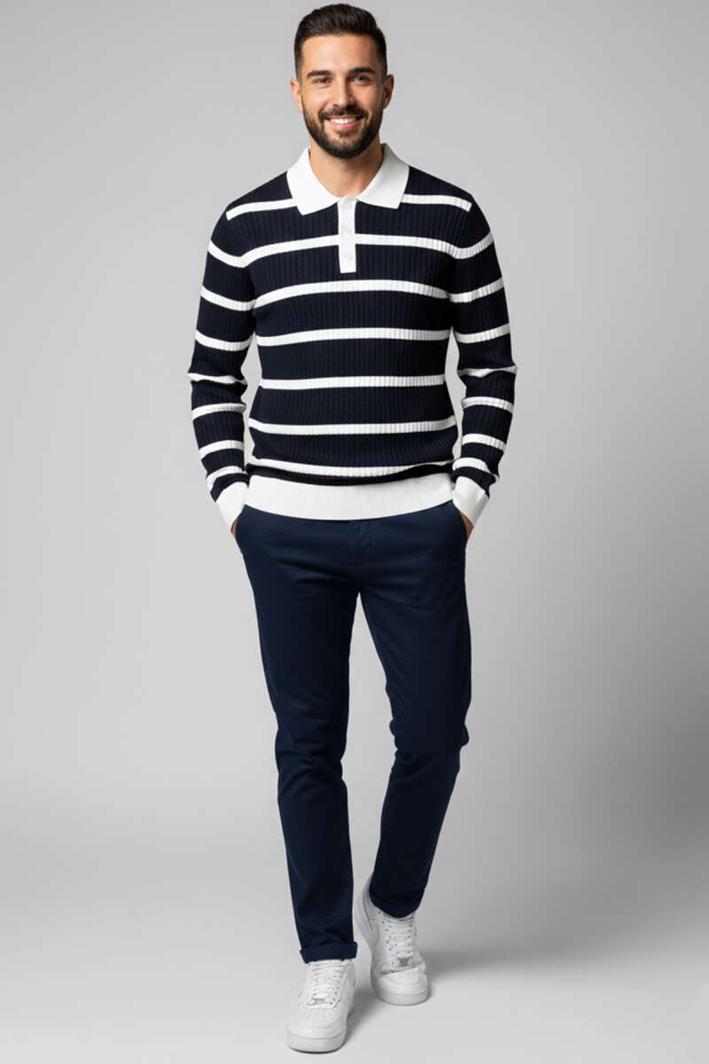 Düğmeli Polo Yaka Renkli Triko Kazak Bej