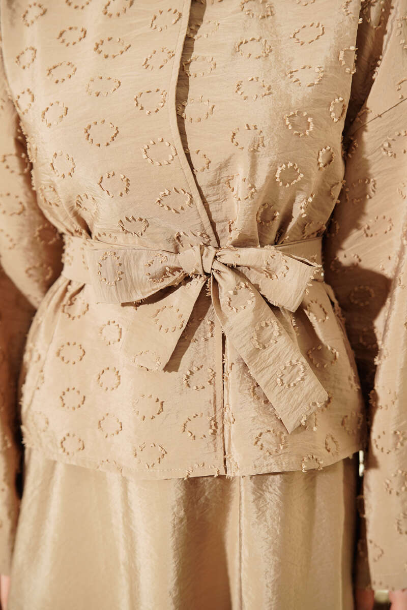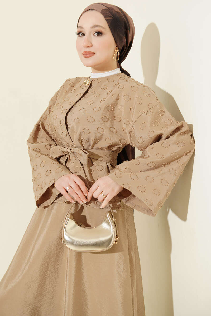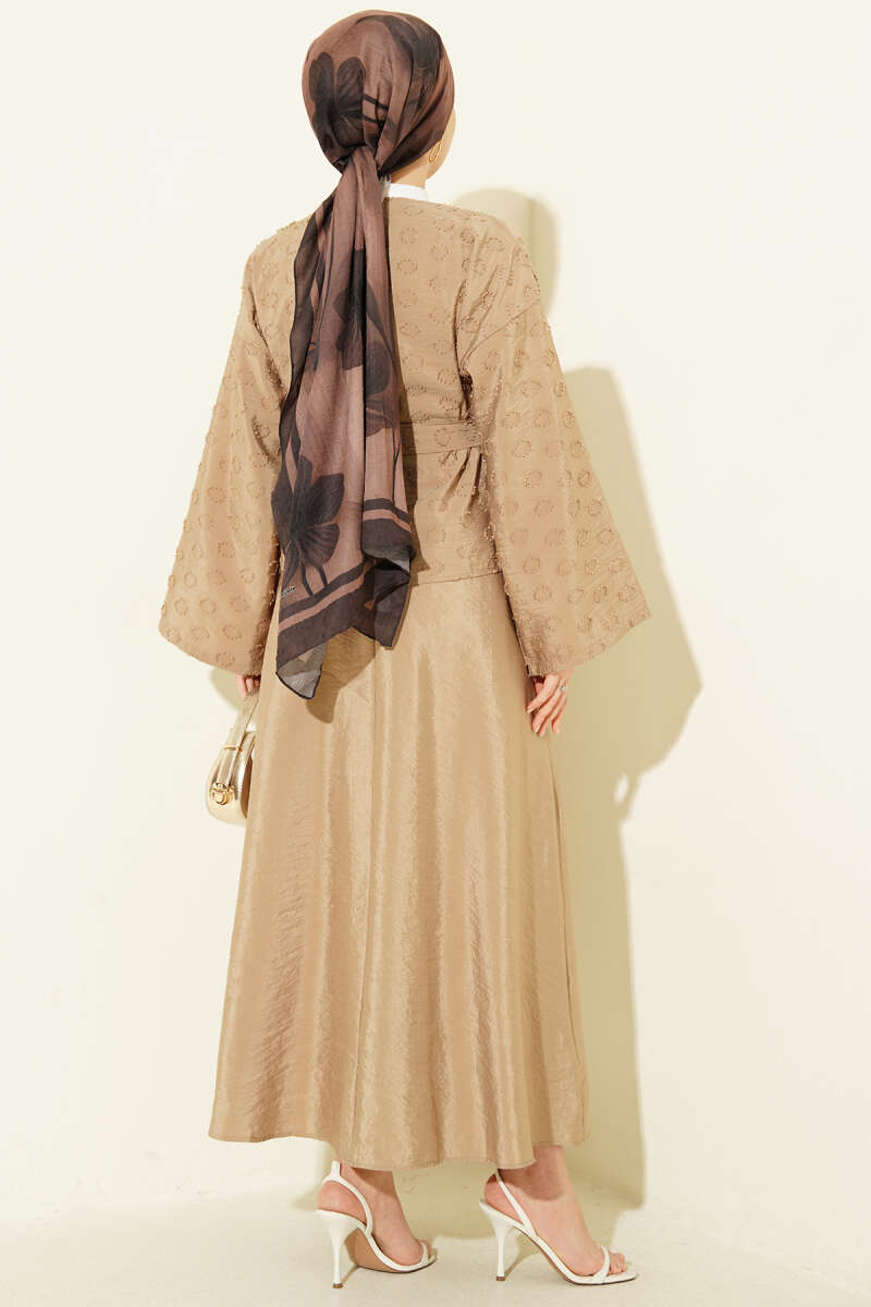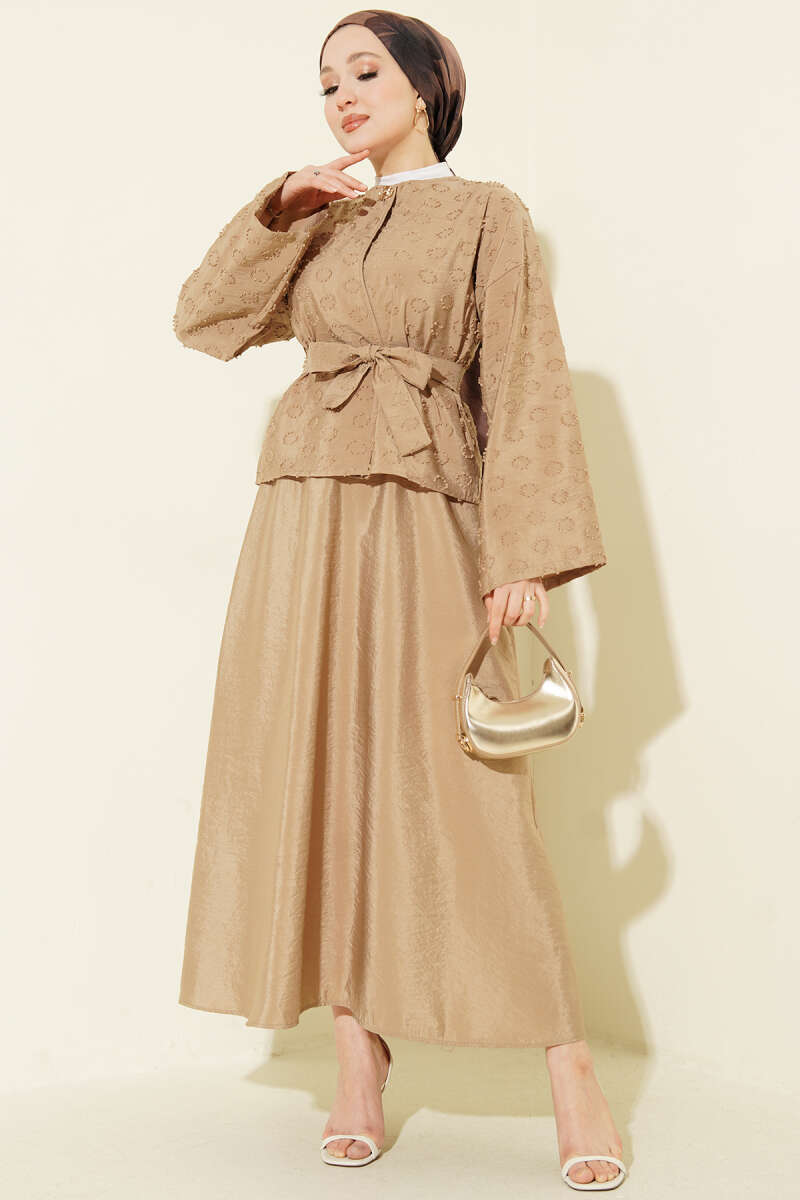 Düğmeli Püskül Detaylı Etekli Takım Latte