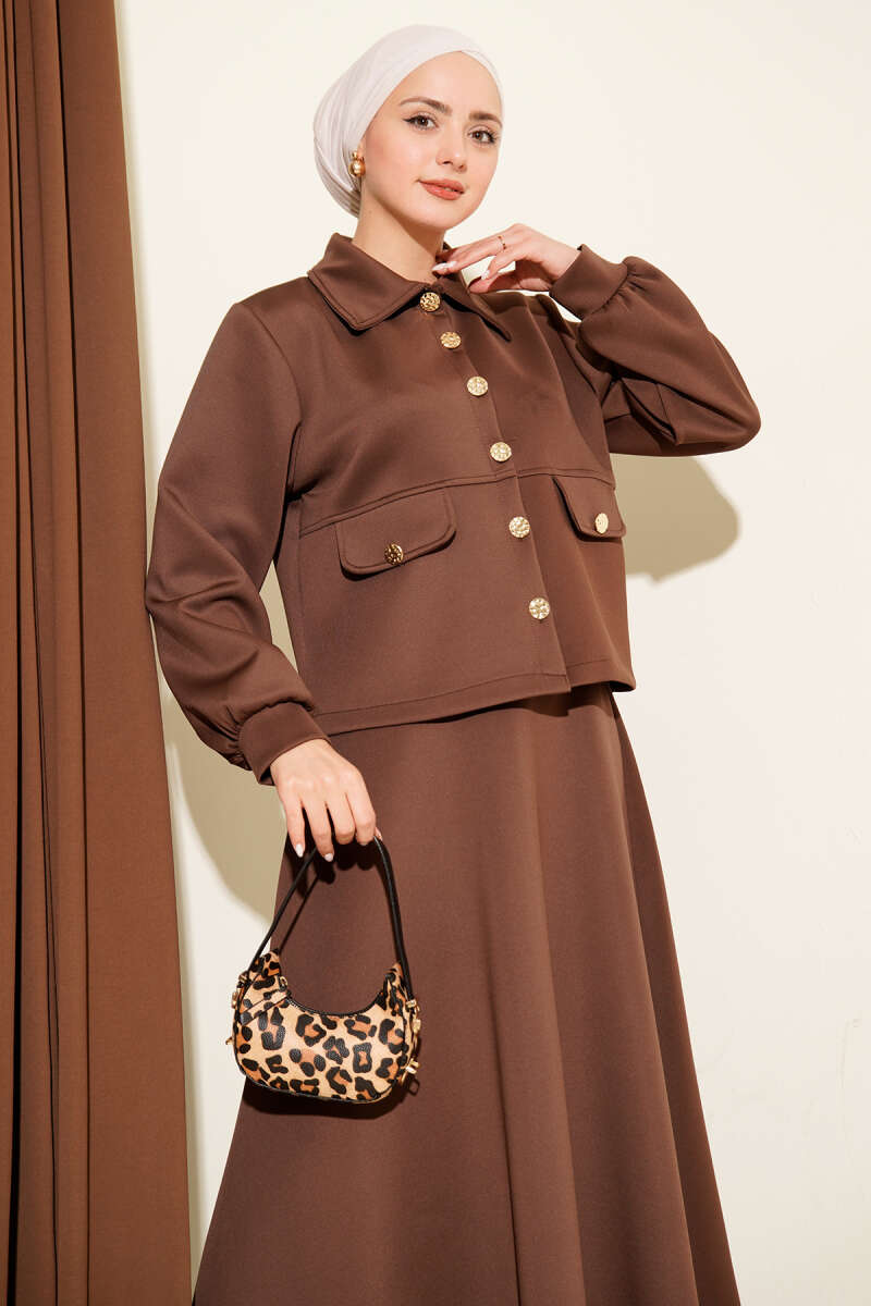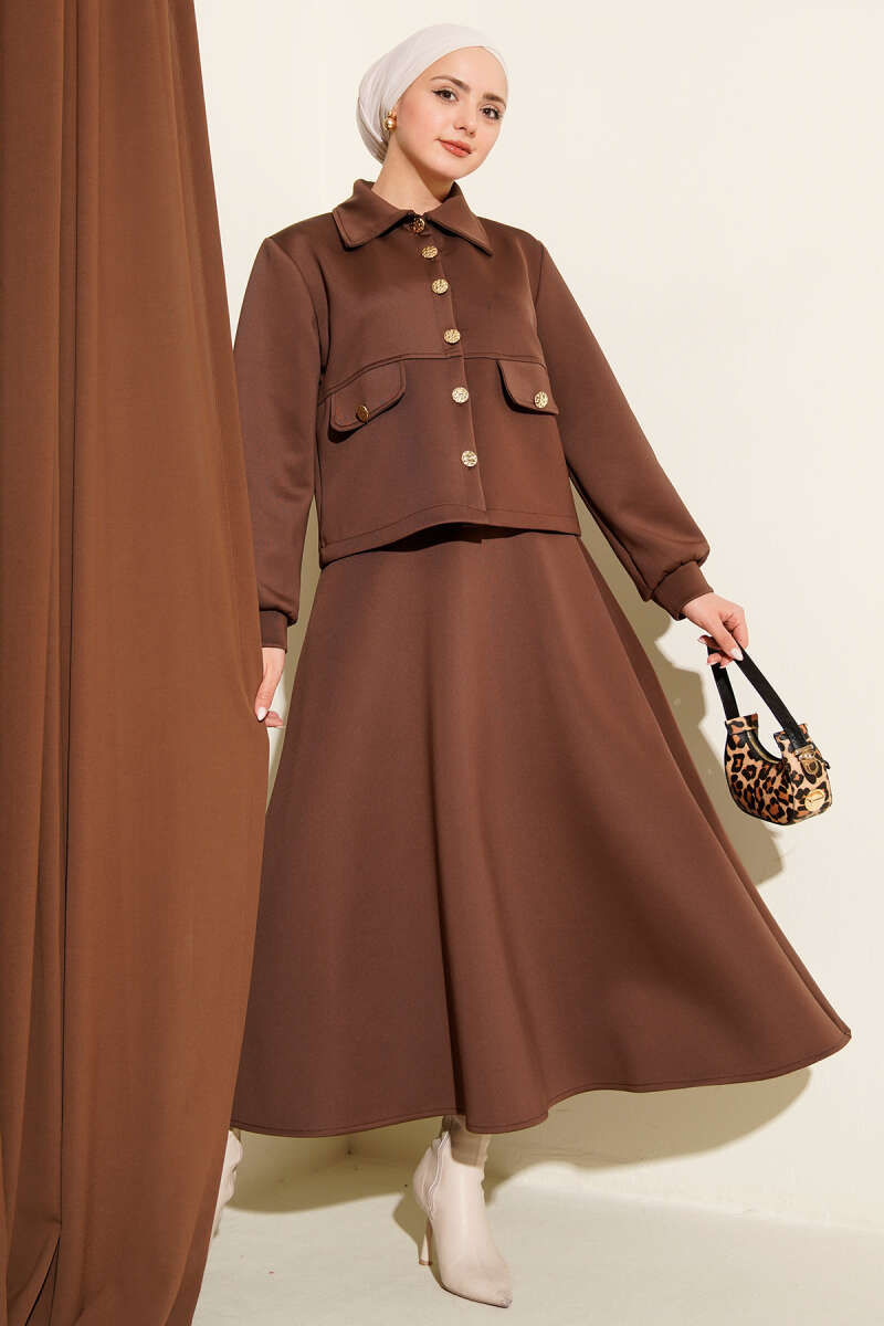 Bebe Yaka Kemerli Scuba İkili Etekli Takım Kahve