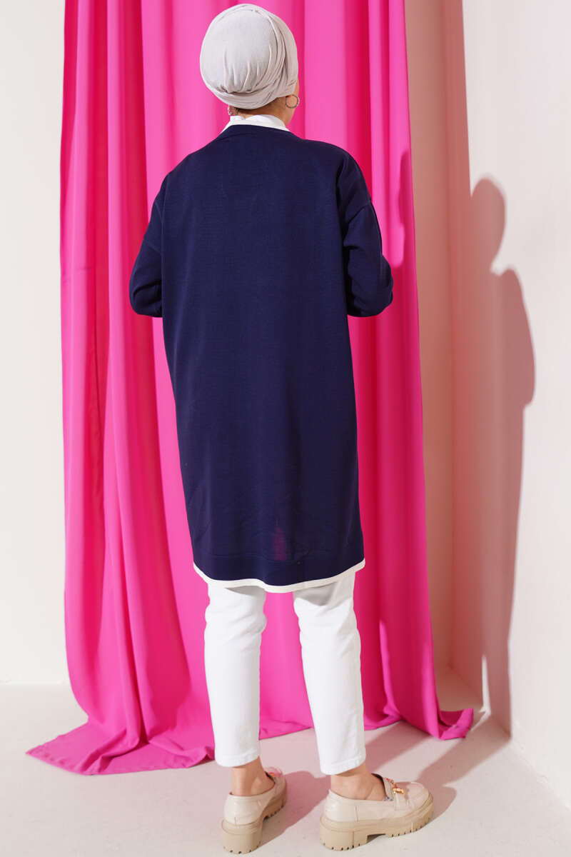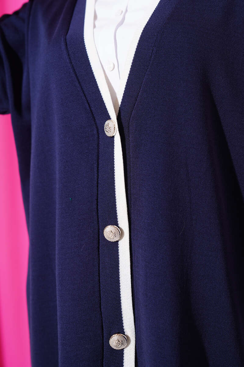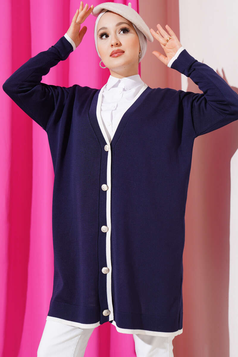 Düğmeli Şerit Detaylı Triko Hırka Lacivert