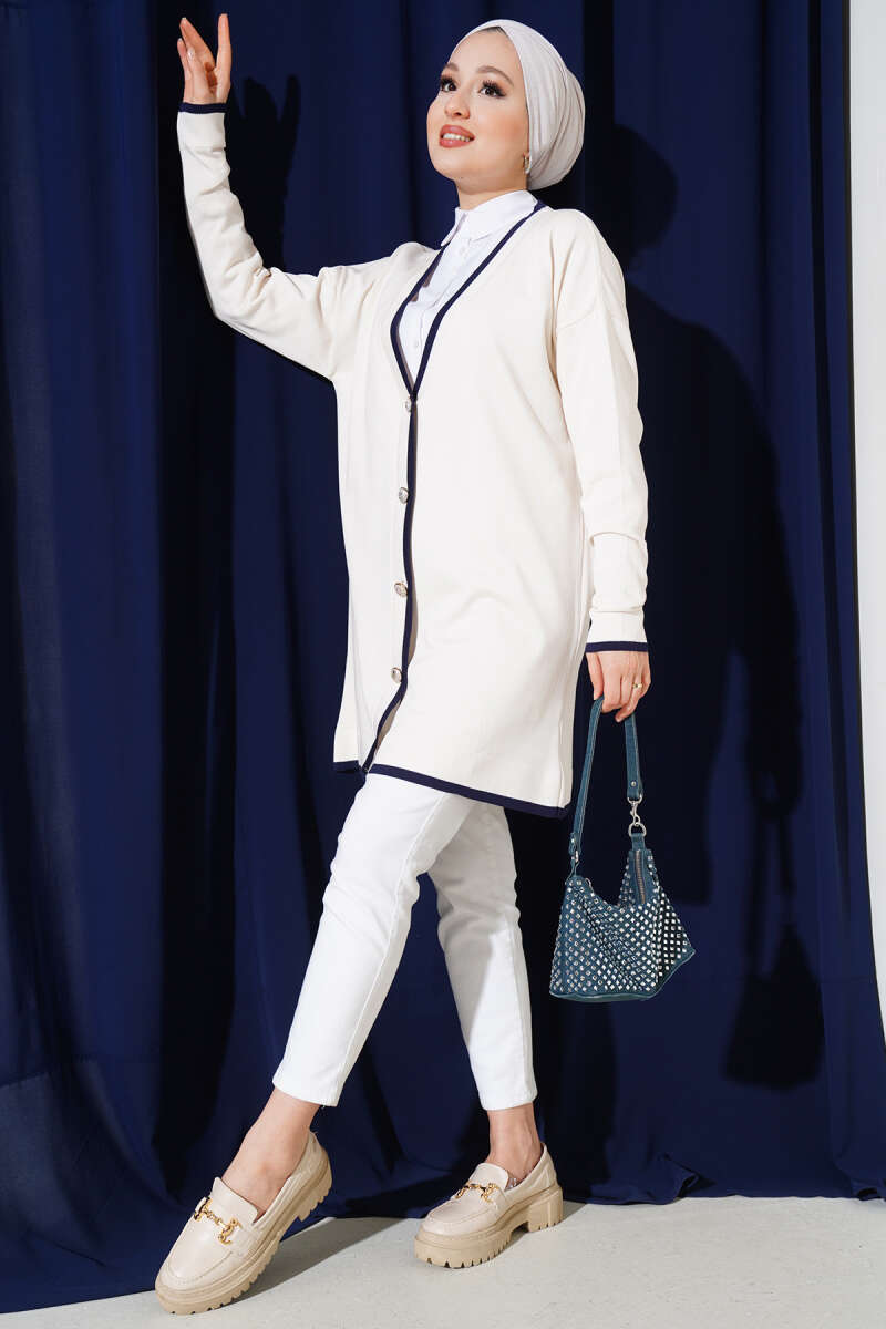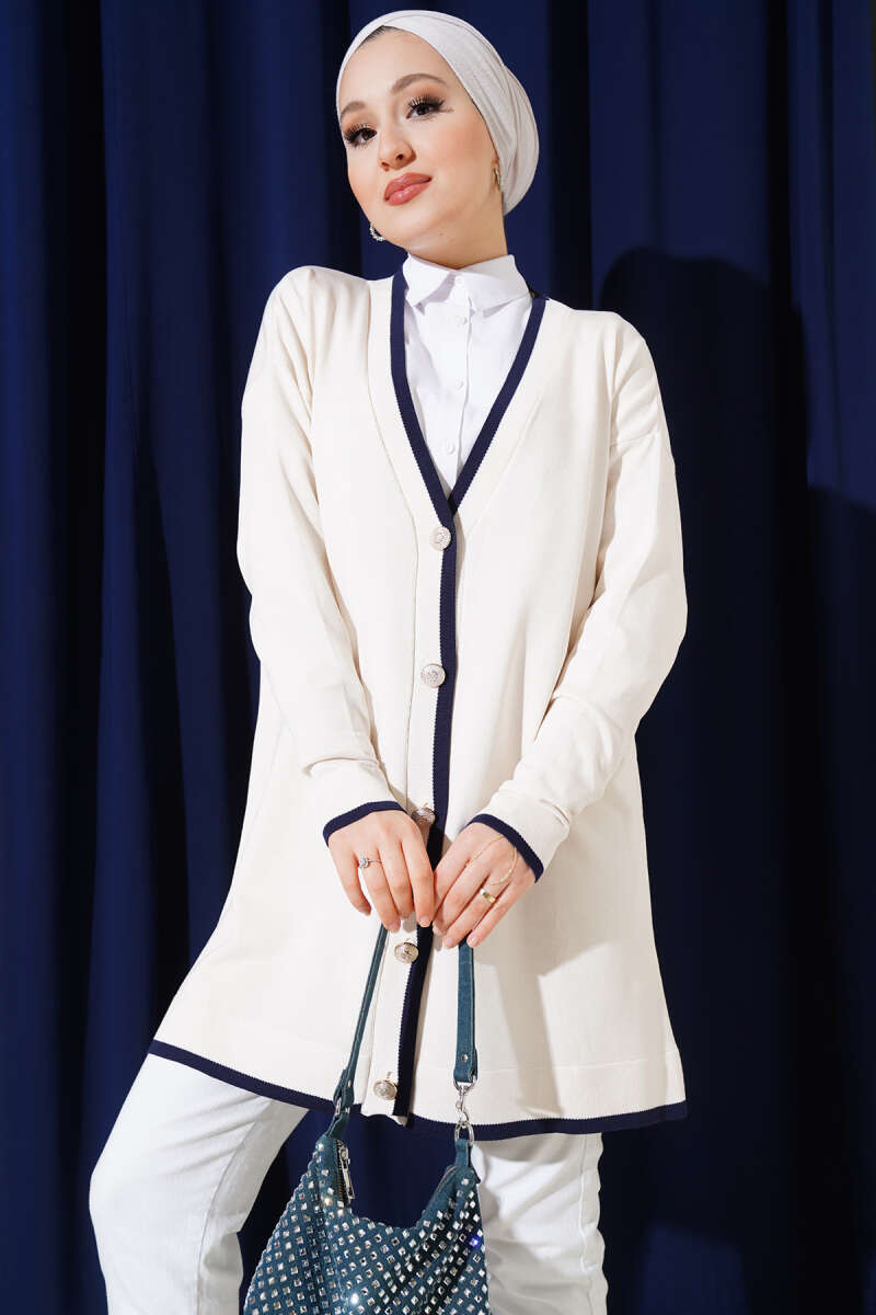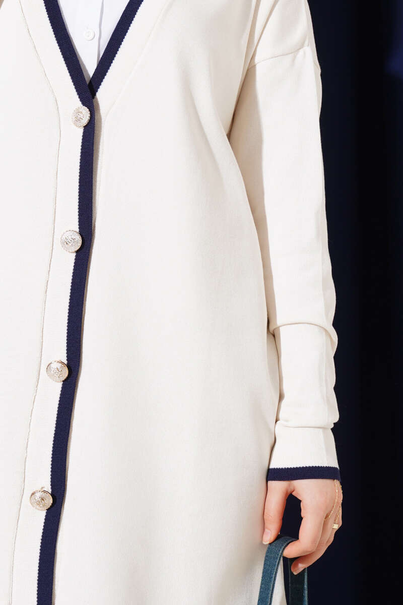 Düğmeli Şerit Detaylı Triko Hırka Vanilya